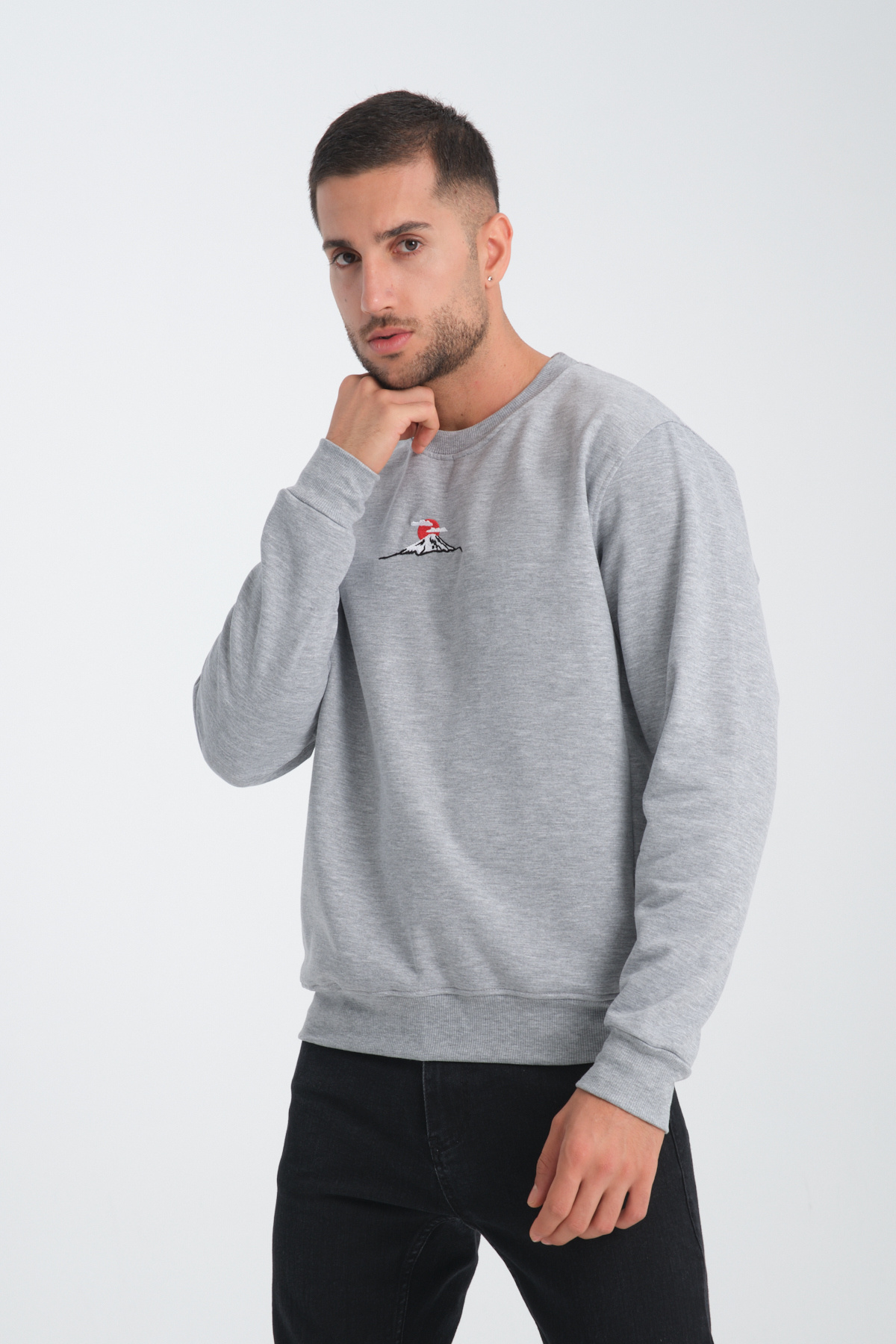 سویشرت یقه گرد مردانه مونت فوجی، گلدوزی شده، خاکستری، نیمه بزرگ