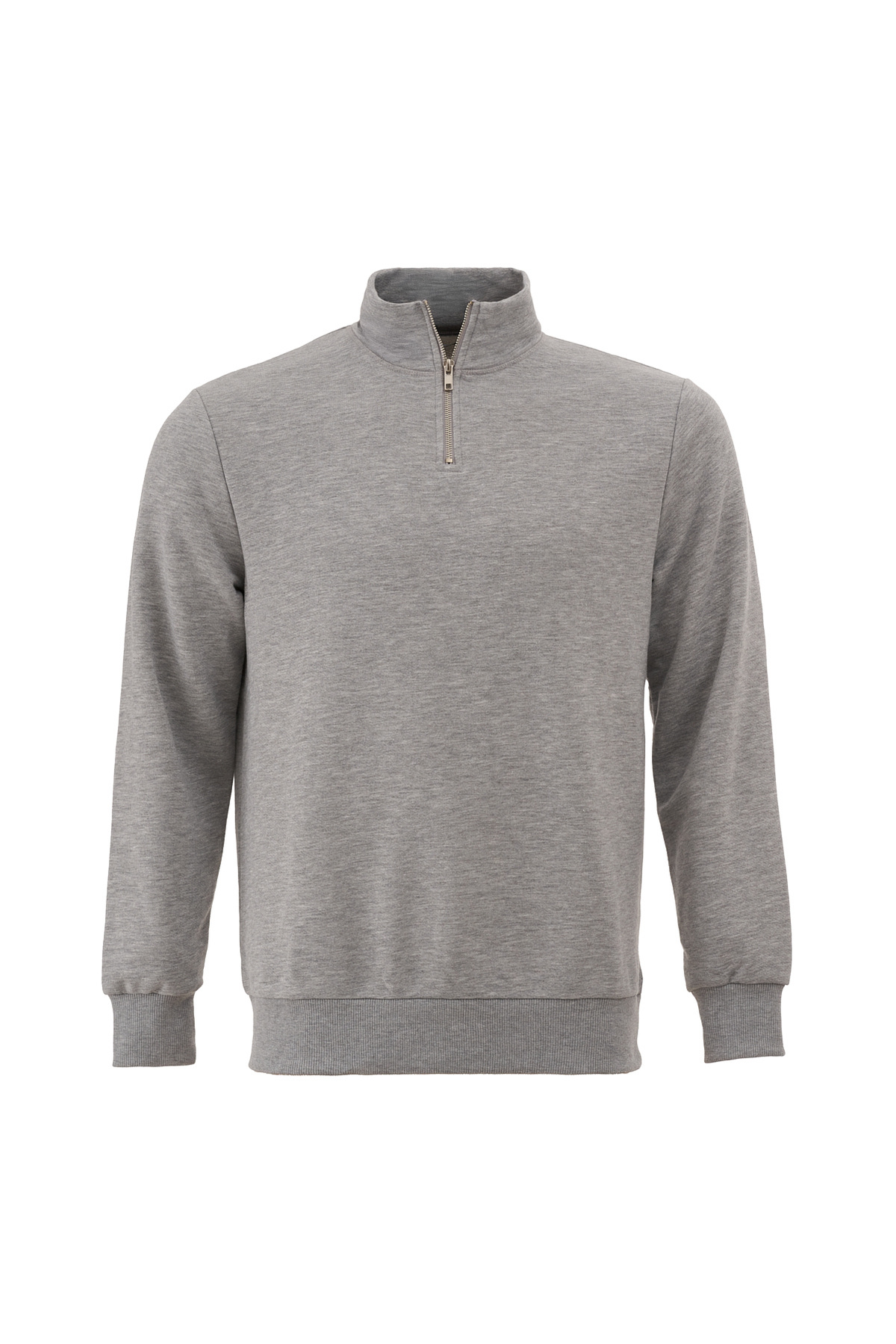 سویشرت نخی مردانه، خاکستری، نرم و لطیف، فیت ریلکس، نیم زیپ، یقه ایستاده، سه نخ، قابل تنفس.