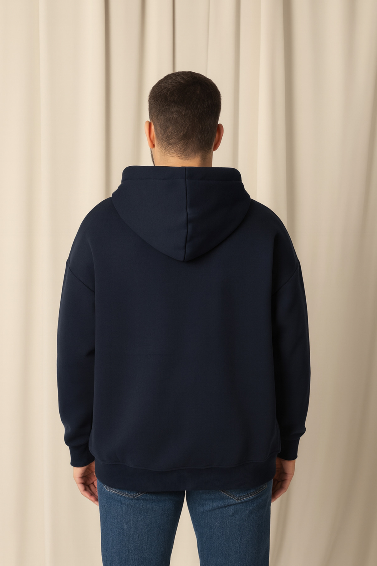 سویشرت مردانه کلاه‌دار زیپ‌دار، نخی، آستر پشمی، جیب کانگورویی، سرمه‌ای