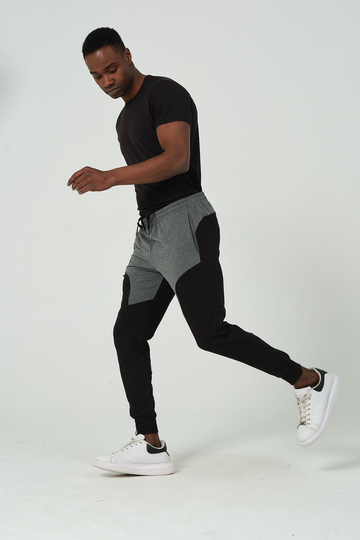 شلوار ورزشی مردانه خاکستری-مشکی با زیپ، ۳ جیب، فیت راحت و فیت باریک.