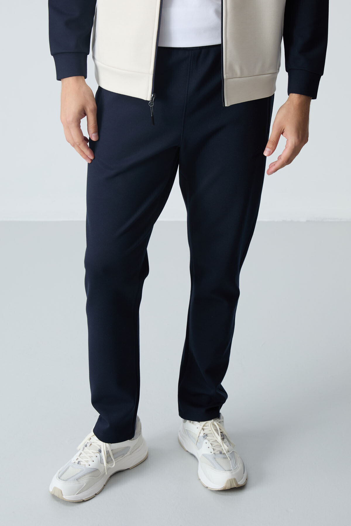 ست ورزشی مردانه دو رنگ یقه ایستاده سرمه‌ای بژ، فیت کلاسیک، فیت و راحت – 85113