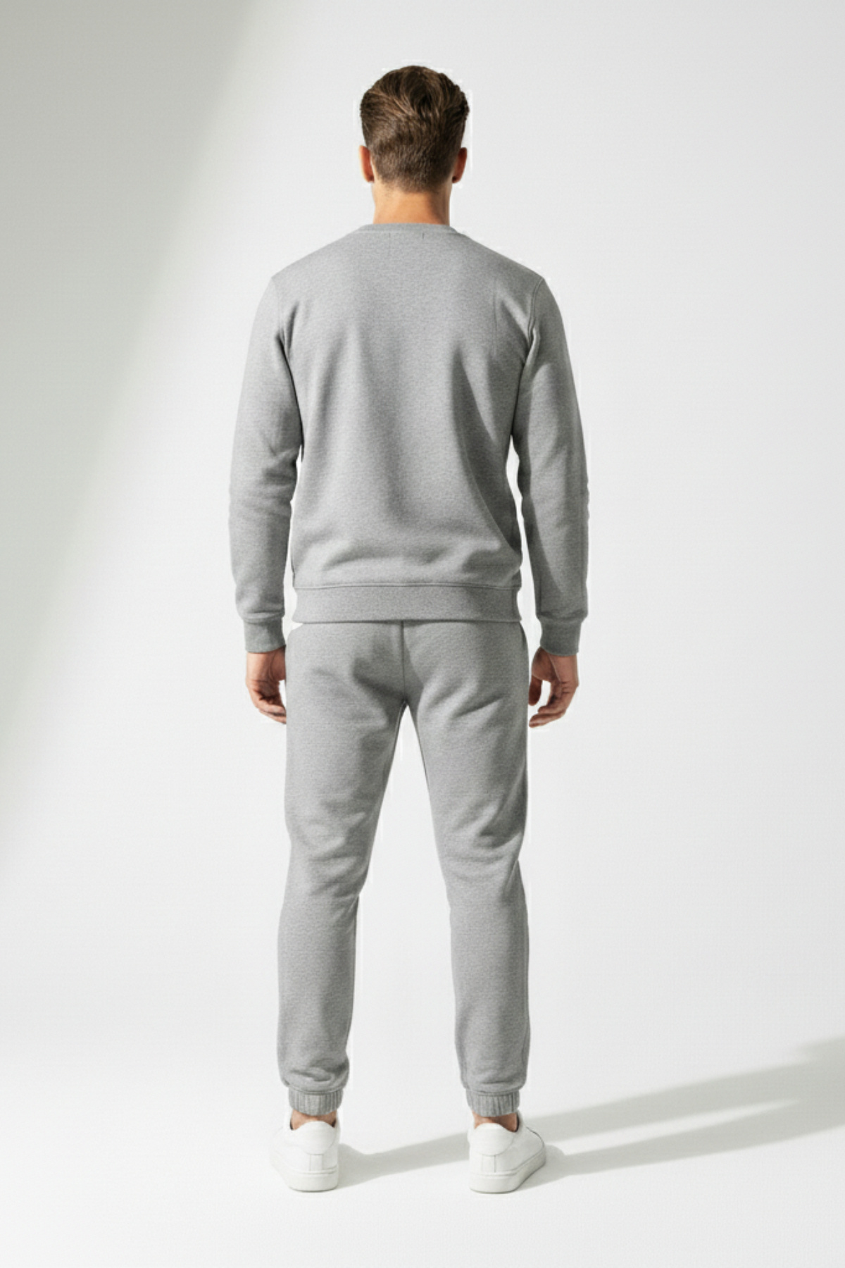 ست دو تکه لباس ورزشی مردانه از جنس پنبه، خاکستری، سایز معمولی، جیب‌های کشی، کمر کشی سه نخ، قابل تنفس.