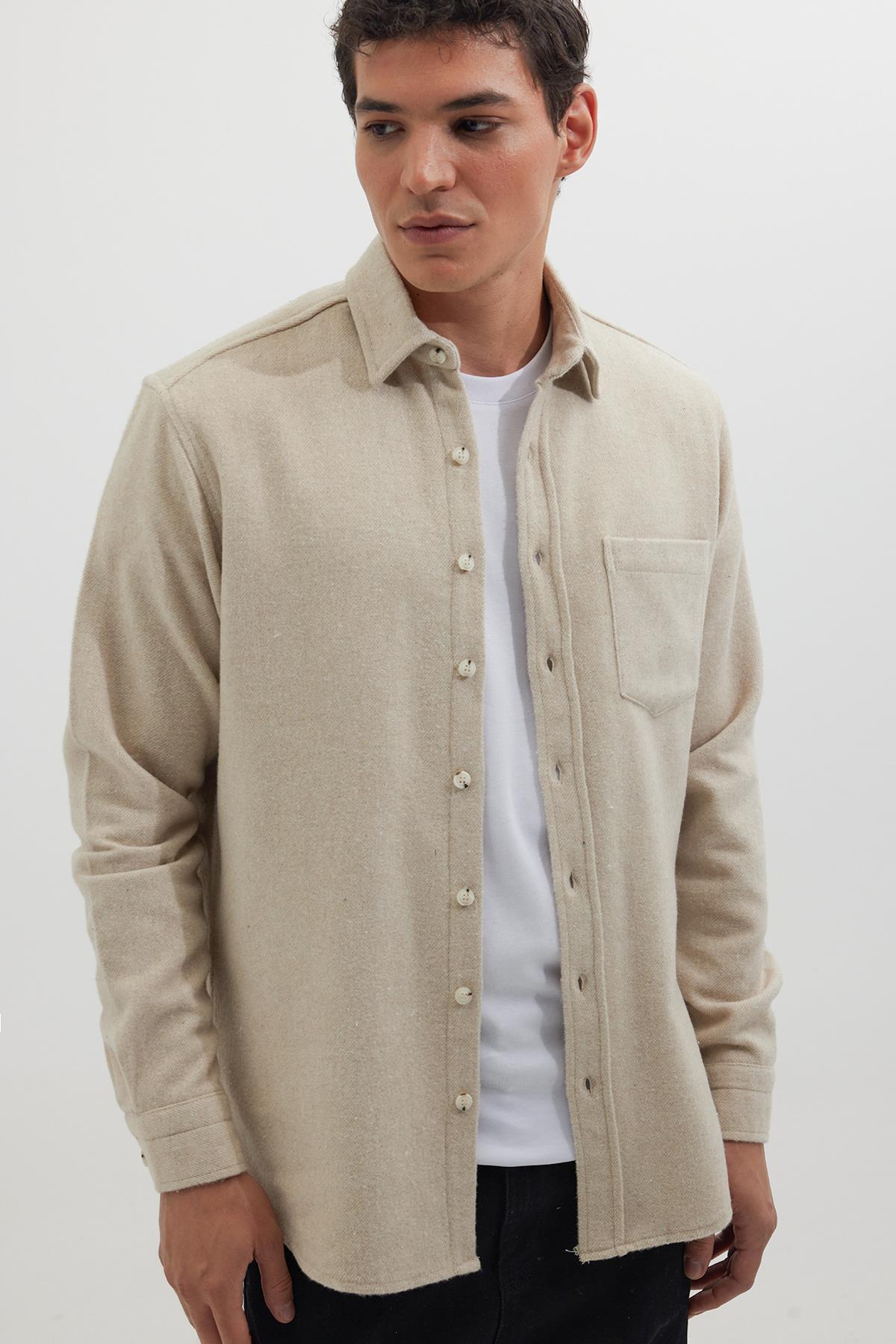 پیراهن مردانه طرح چوب بژ تیره، برش معمولی، کلاسیک، جیب ساده