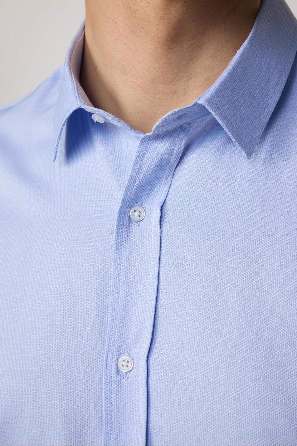 پیراهن آبی مردانه مدرن اسلیم فیت آستین بلند نخی بافتدار Easy Iron