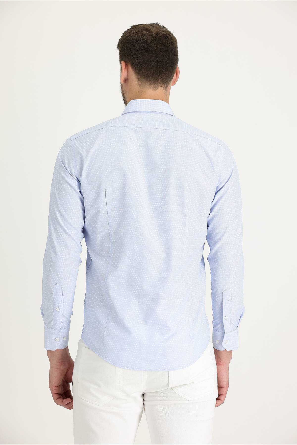 پیراهن نخی آکسفورد طرحدار، آستین بلند، باریک، خوشدوخت، اتوکشی آسان.