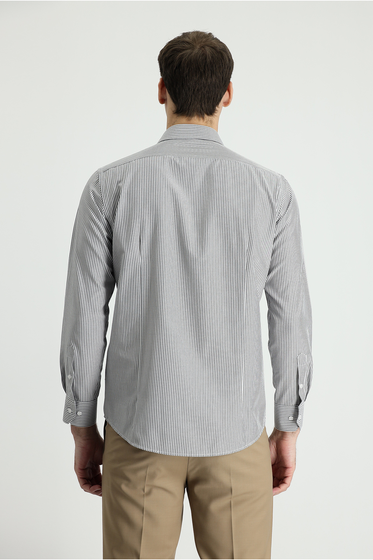 پیراهن نخی راه راه، آستین بلند، باریک، فیت، با قابلیت اتوکشی آسان.