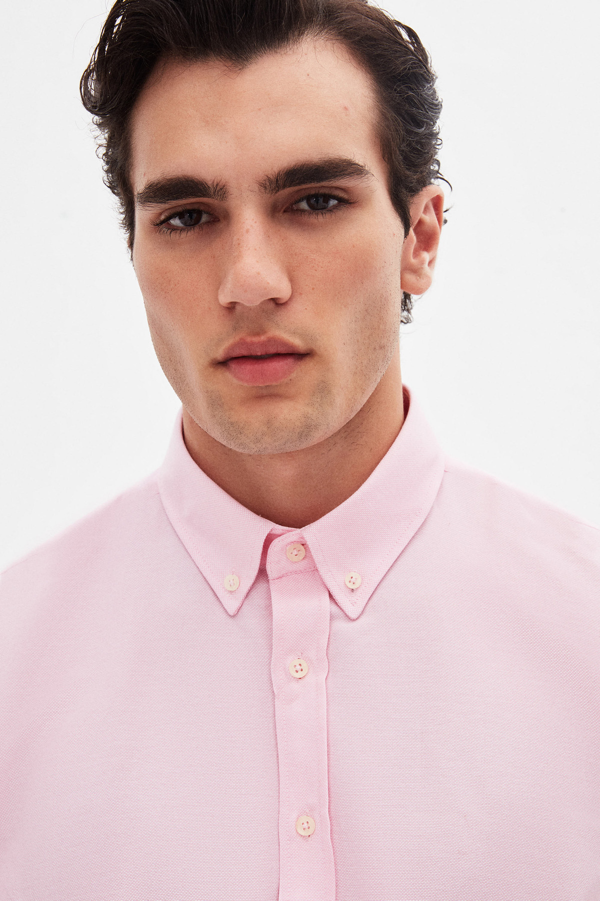 پیراهن نخی یقه دکمهدار بافتدار صورتی DS Damat Slim Fit