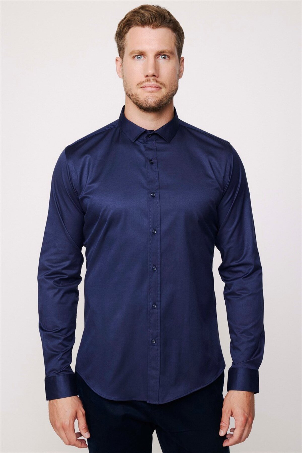 پیراهن مردانه سرمهای آستین بلند اسلیم فیت طرح لیکرا، جنس ساتن نخی ساده