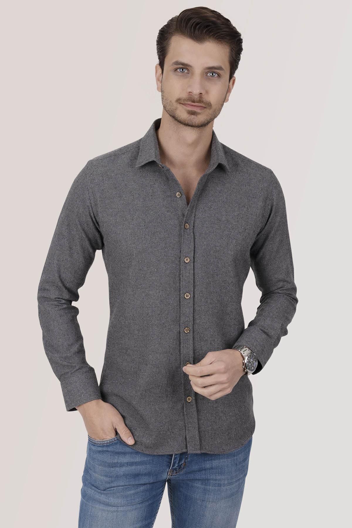 پیراهن مردانه اسلیم فیت طرح چوب جنگلی ساده دودی در جعبه کادویی