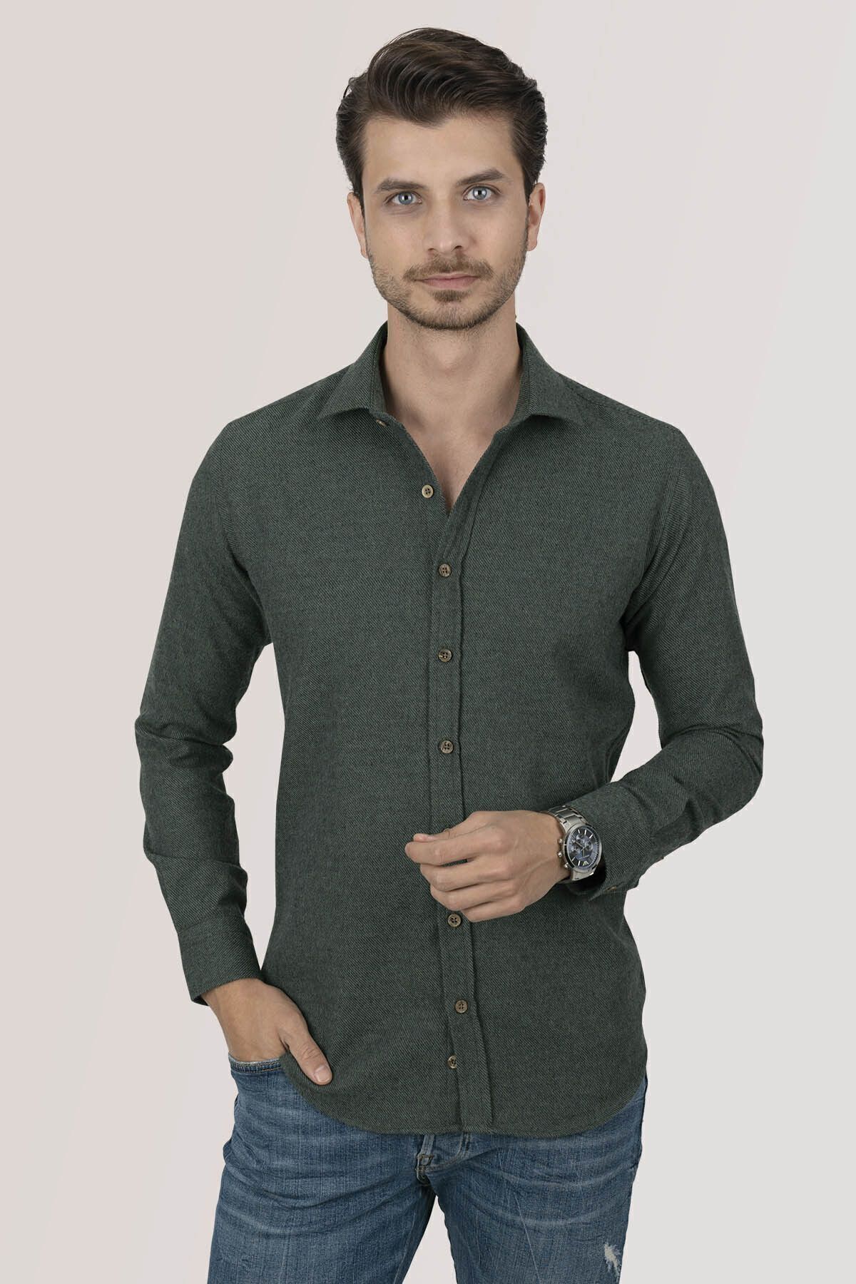پیراهن مردانه اسلیم فیت طرح چوب جنگلی ساده سبز تیره با جعبه هدیه