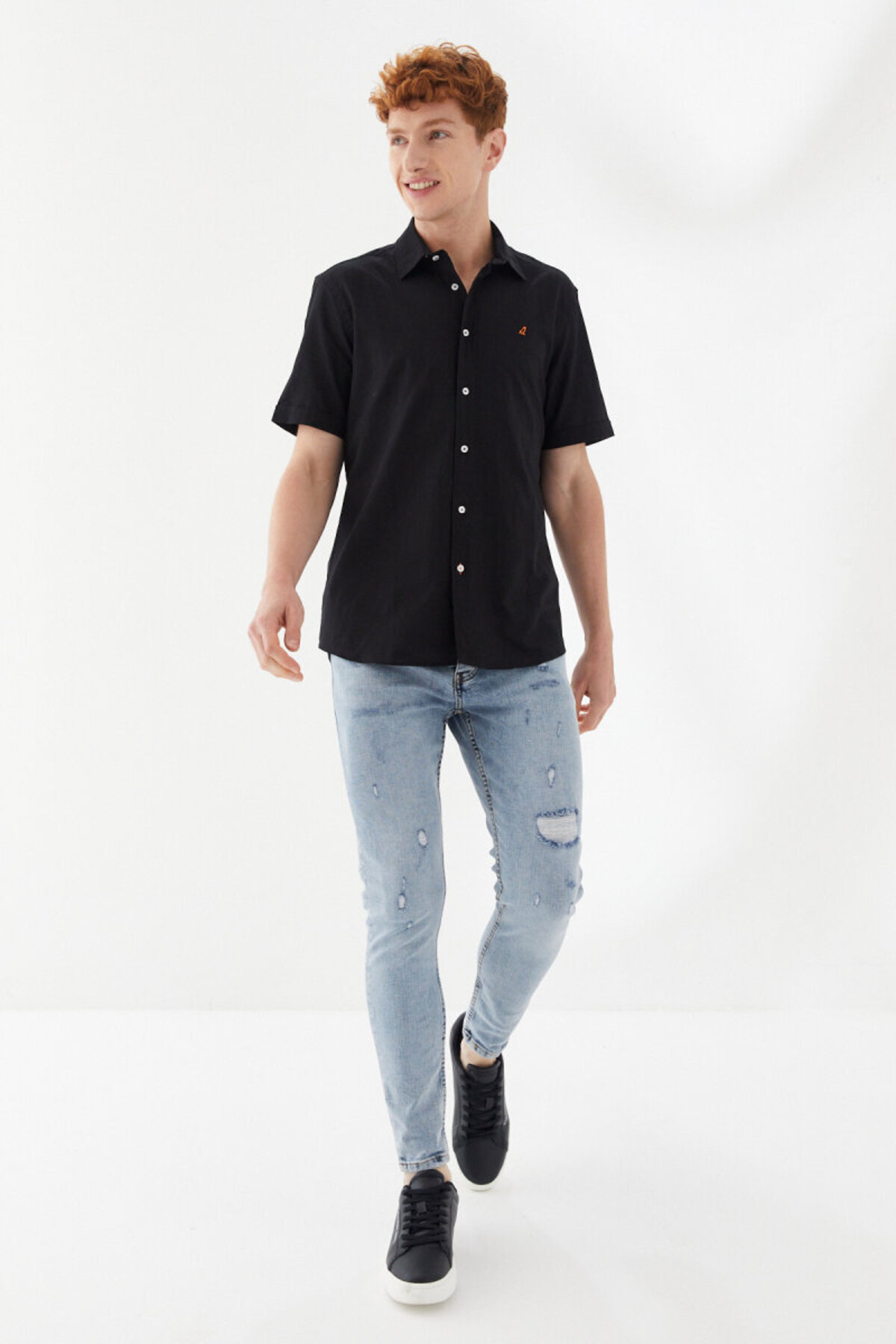 پیراهن کتانی آستین کوتاه مشکی معمولی با سینه دوزی و طرح ساده