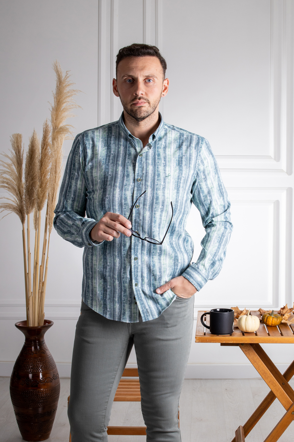 مصاحبه با سارار گویاس، پیراهن اسلیم فیت سبز طرحدار یقه دکمهدار