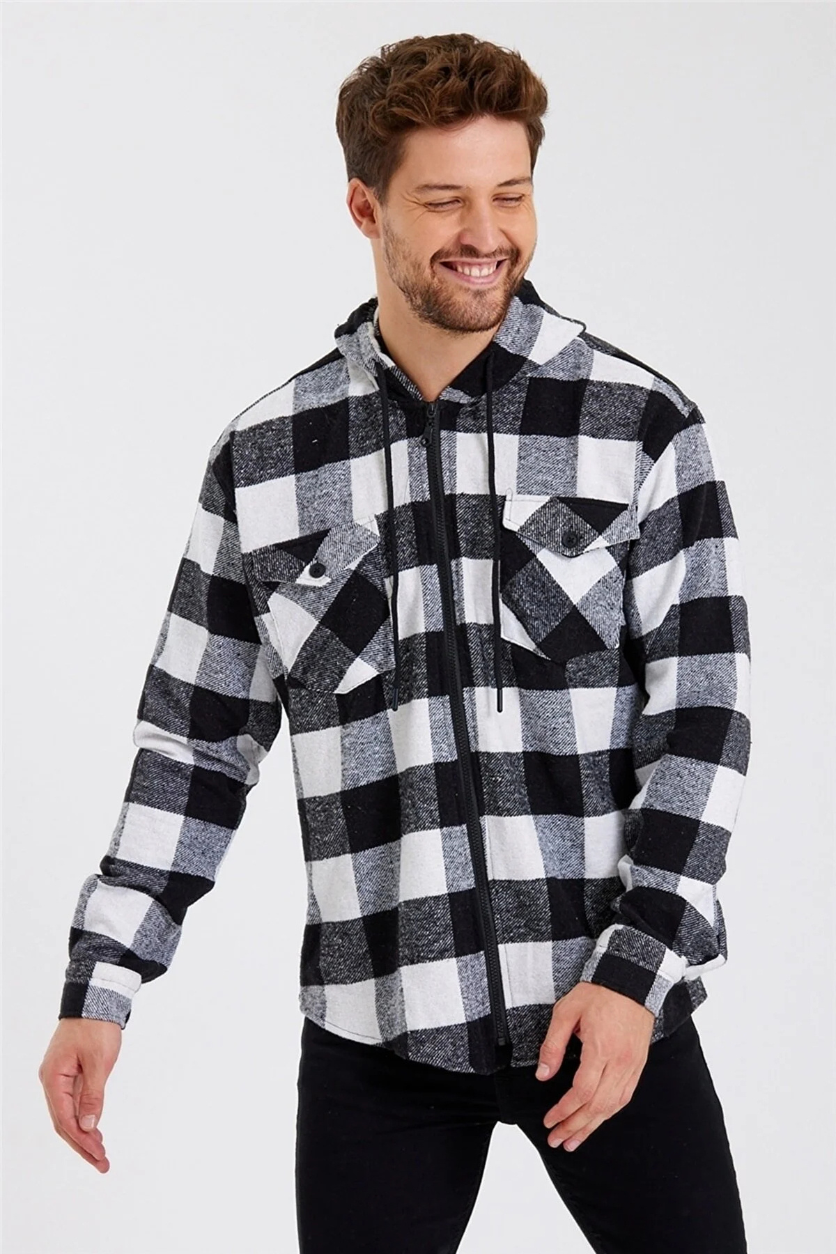 پیراهن مردانه اسلیم فیت طرح چوب ضخیم طرح چهارخانه کشمیری کلاه دار با جیب و زیپ
