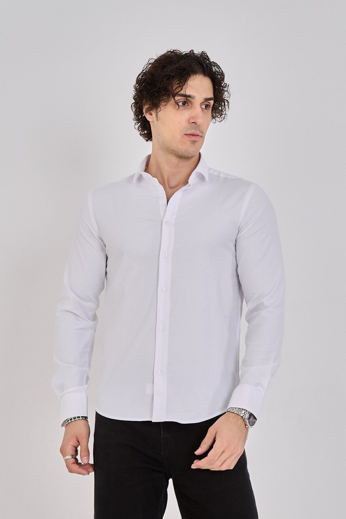 پیراهن سفید اسلیم فیت، مناسب برای مناسبتهای خاص و استفاده روزمره، نخی، یقه ایتالیایی، سبک، انعطافپذیر و راحت.