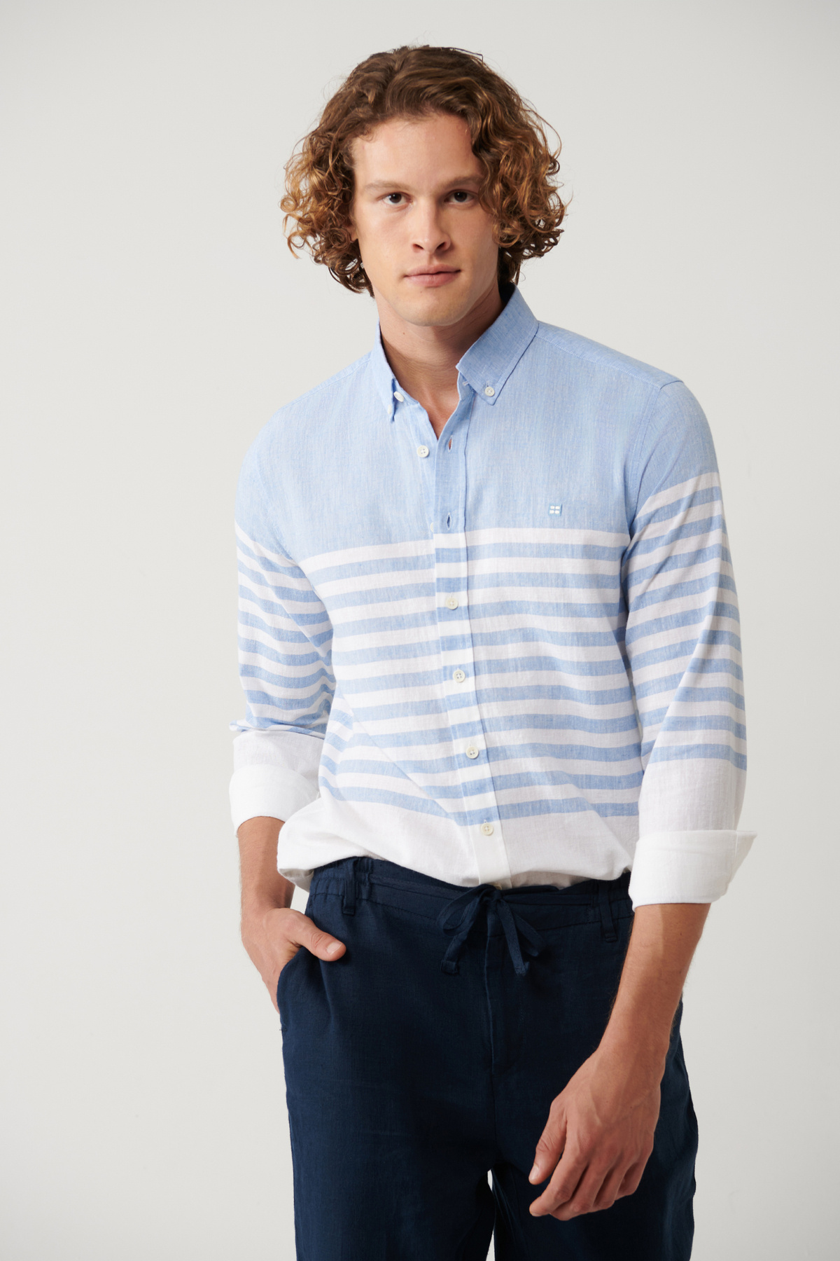 پیراهن مردانه یقه دکمهدار آبی طرح راه راه، اسلیم فیت A41Y2190