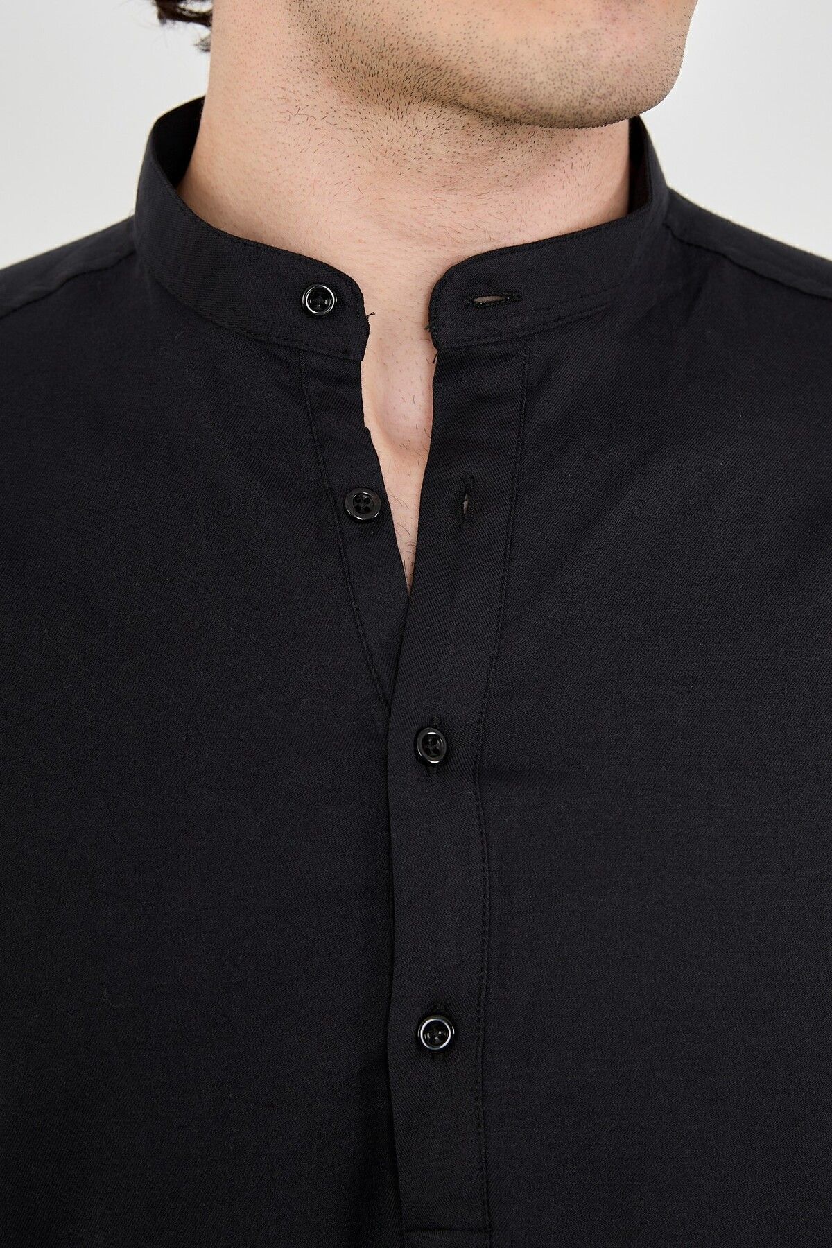 پیراهن مردانه نخی انعطافپذیر یقه ماندارین مشکی نیمتنه اسلیم فیت