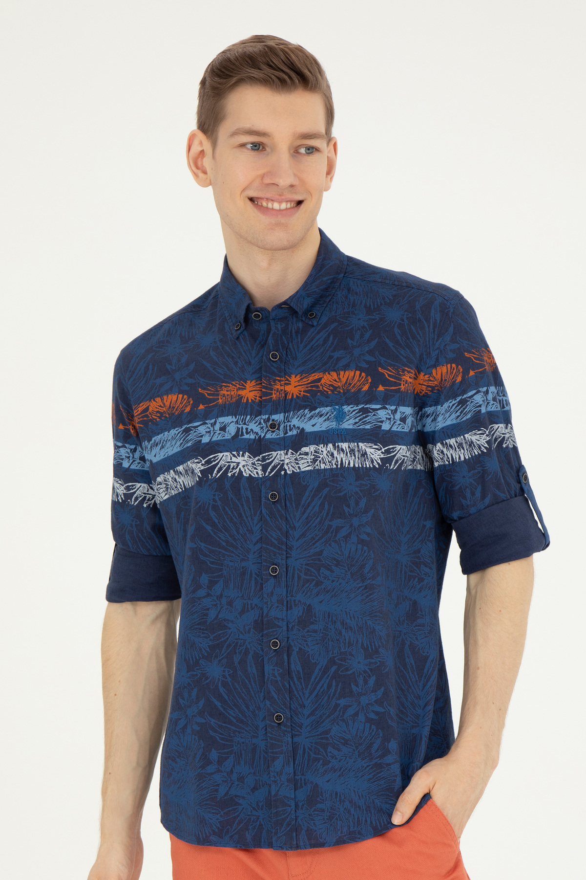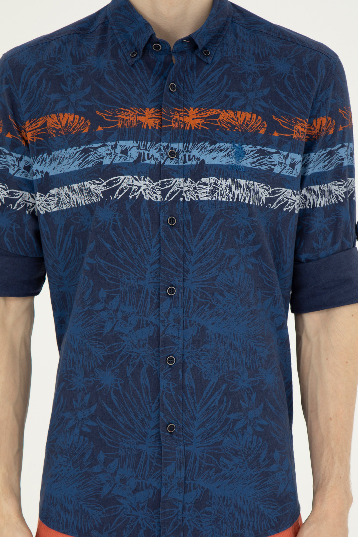 پیراهن یو اس پولو آبی سرمه ای آستین بلند کتان پنبه ای | | نمایندگی یو اس پولو