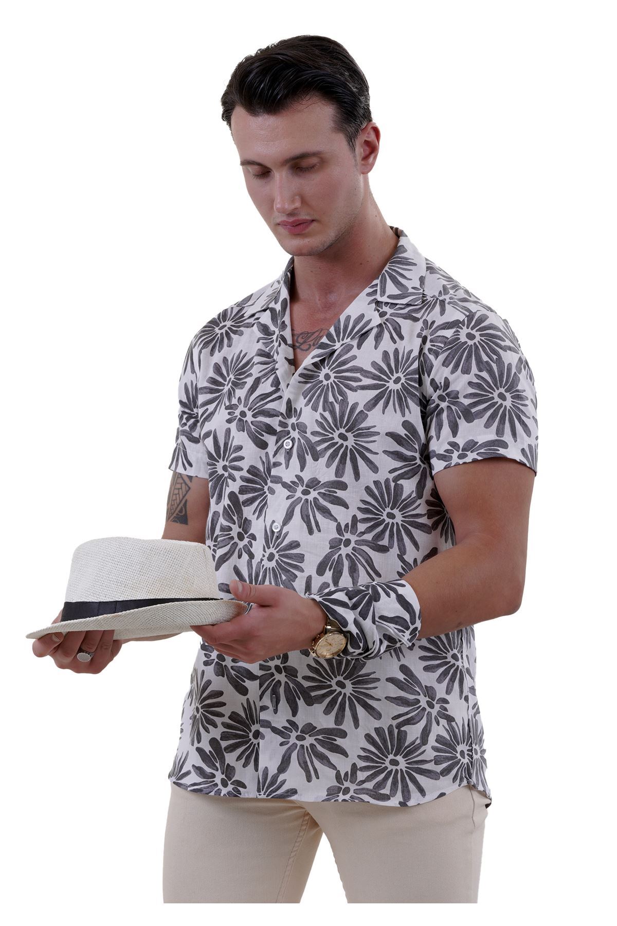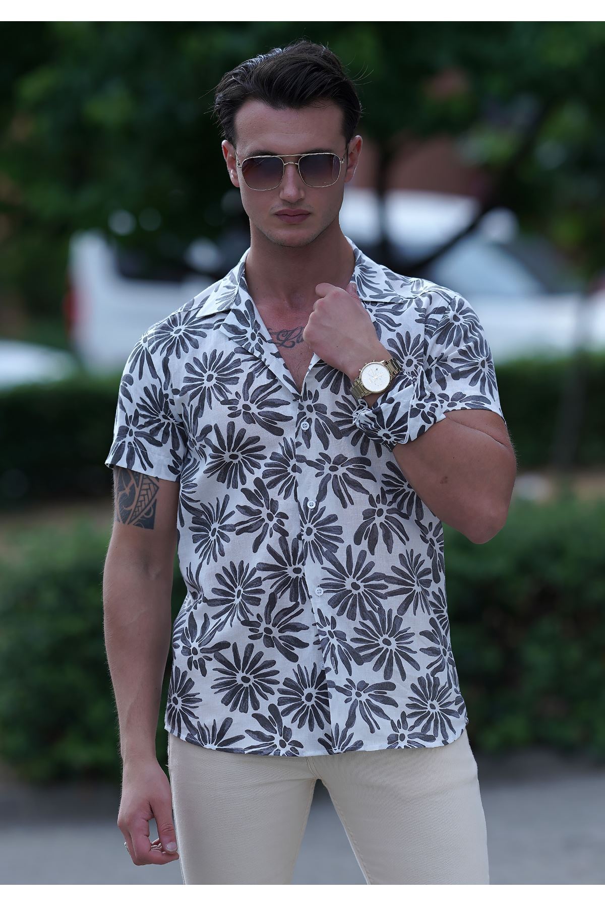 پیراهن آستین کوتاه تابستانی طرح هاوایی طرح گلدار سفید با طرح مشکی