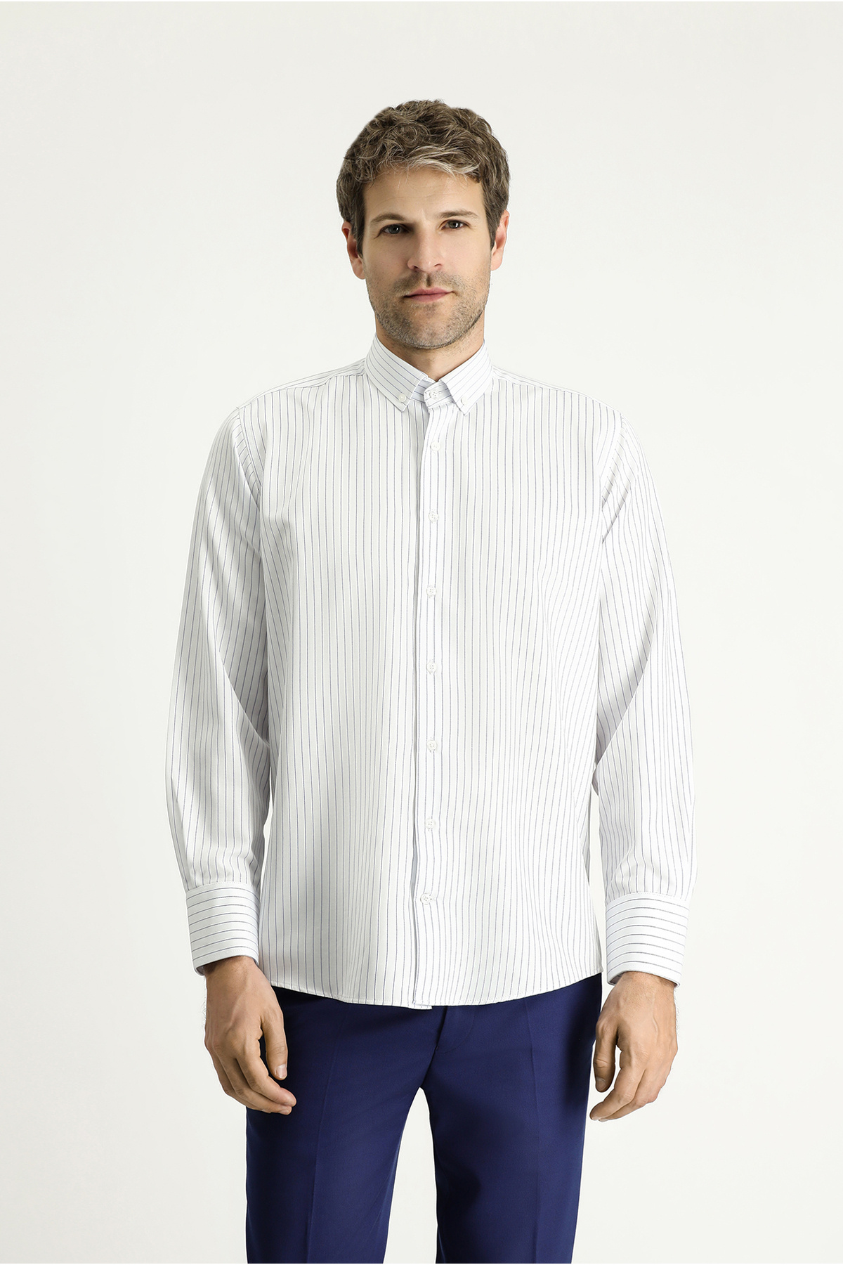 پیراهن نخی راه راه کلاسیک آستین بلند، اتوکشی آسان.