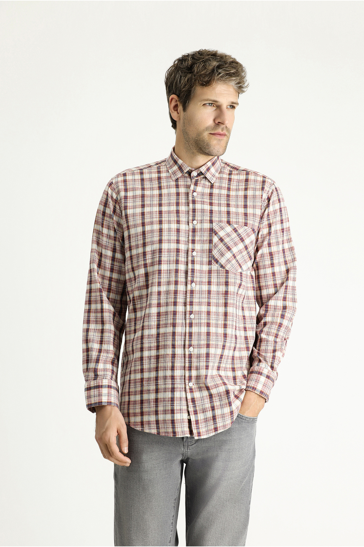 پیراهن نخی چهارخانه آستین بلند معمولی
