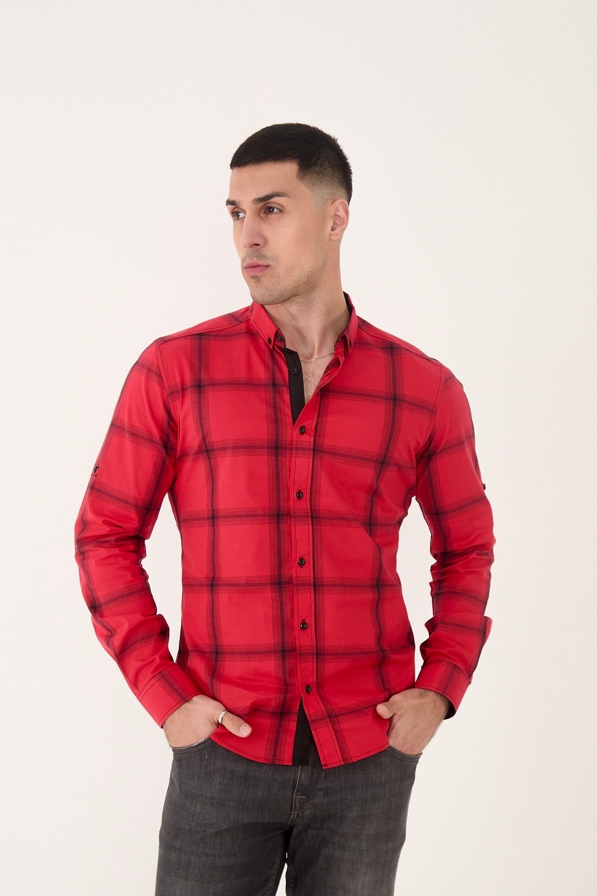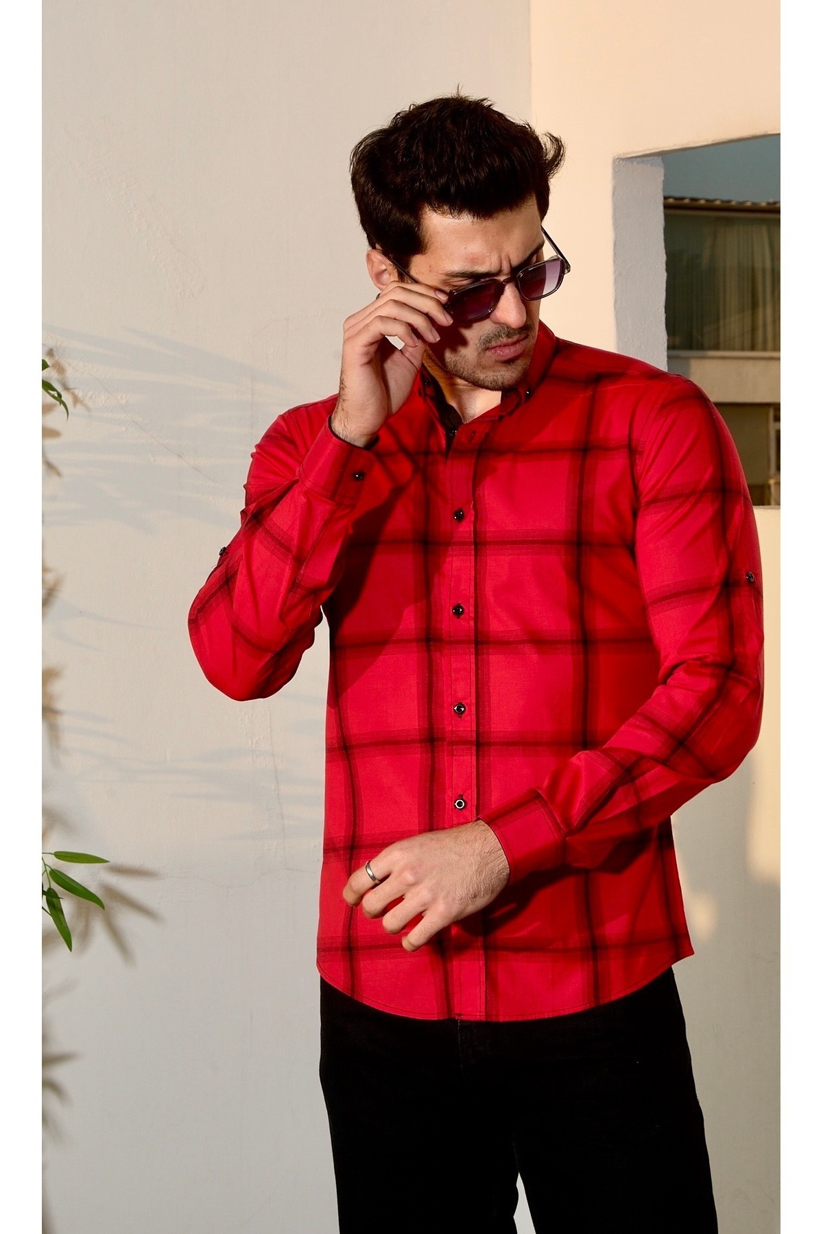 پیراهن اسلیم فیت طرح چهارخانه نخی قرمز/مشکی طرح لاکرا