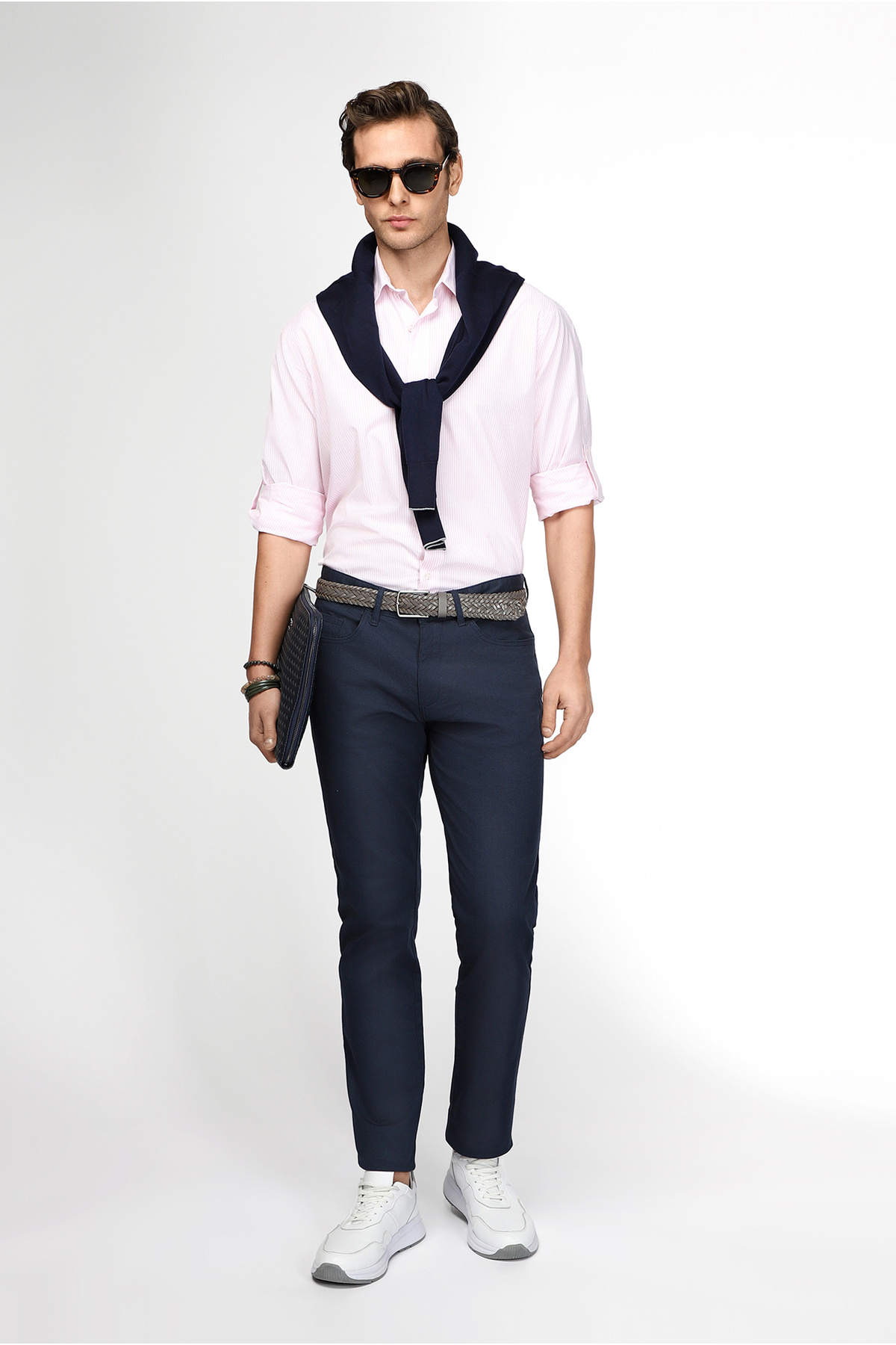 پیراهن آستین بلند، فیت معمولی، راه راه، نخی، و راحت اتو میشود.
