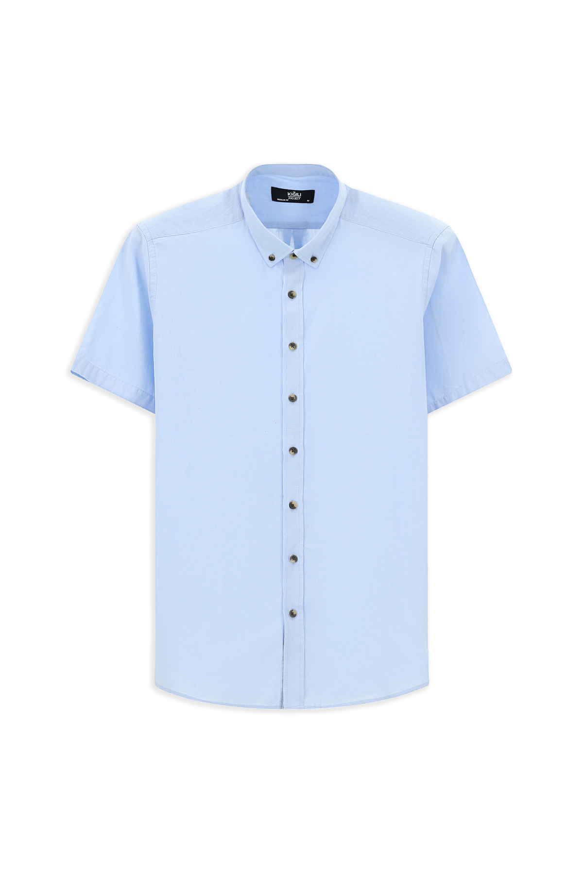 پیراهن ورزشی نخی با آستین کوتاه، فیت معمولی، یقه دکمهدار، و ظاهری شبیه کتان.