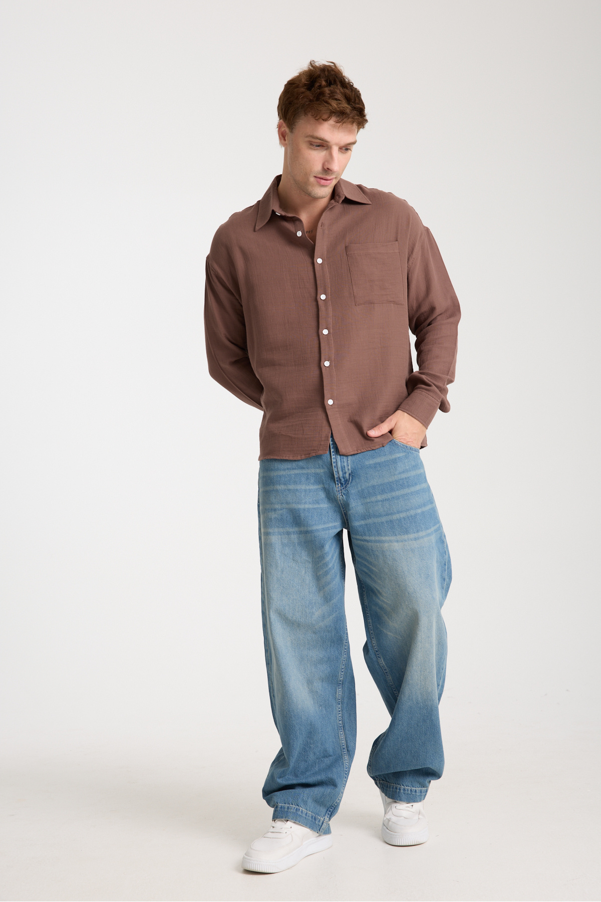 پیراهن مردانه آستین بلند گشاد جیب دار از جنس پارچه کتان ۱۰۰٪ نخی طرح موسلین