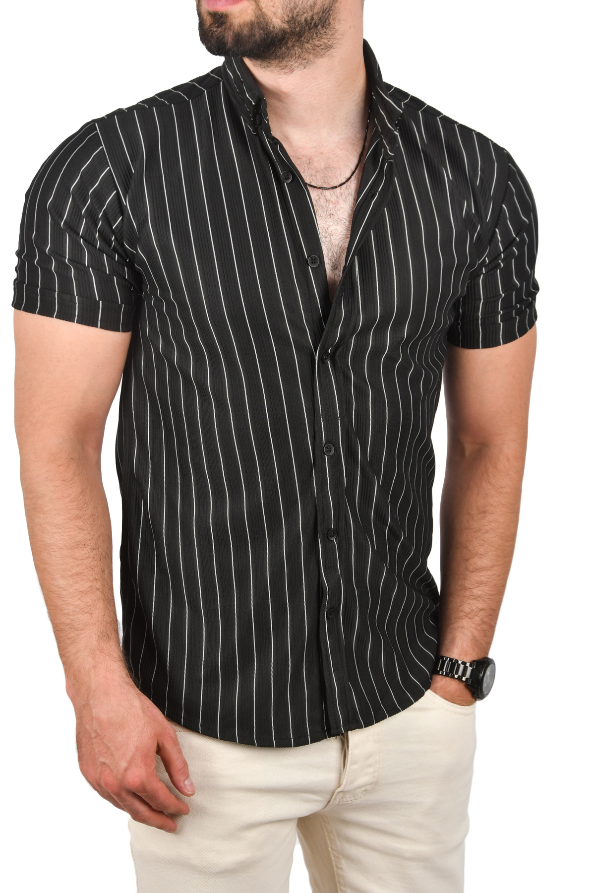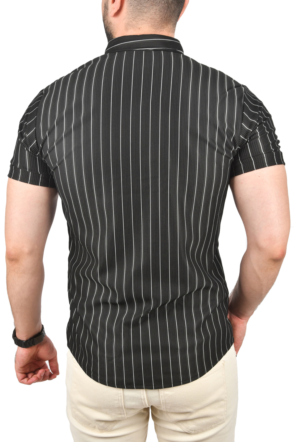 پیراهن ورزشی مردانه مشکی اسلیم فیت لایکرا، برش باریک، راه راه، آستین کوتاه ۲۵۰۱۲۱۸