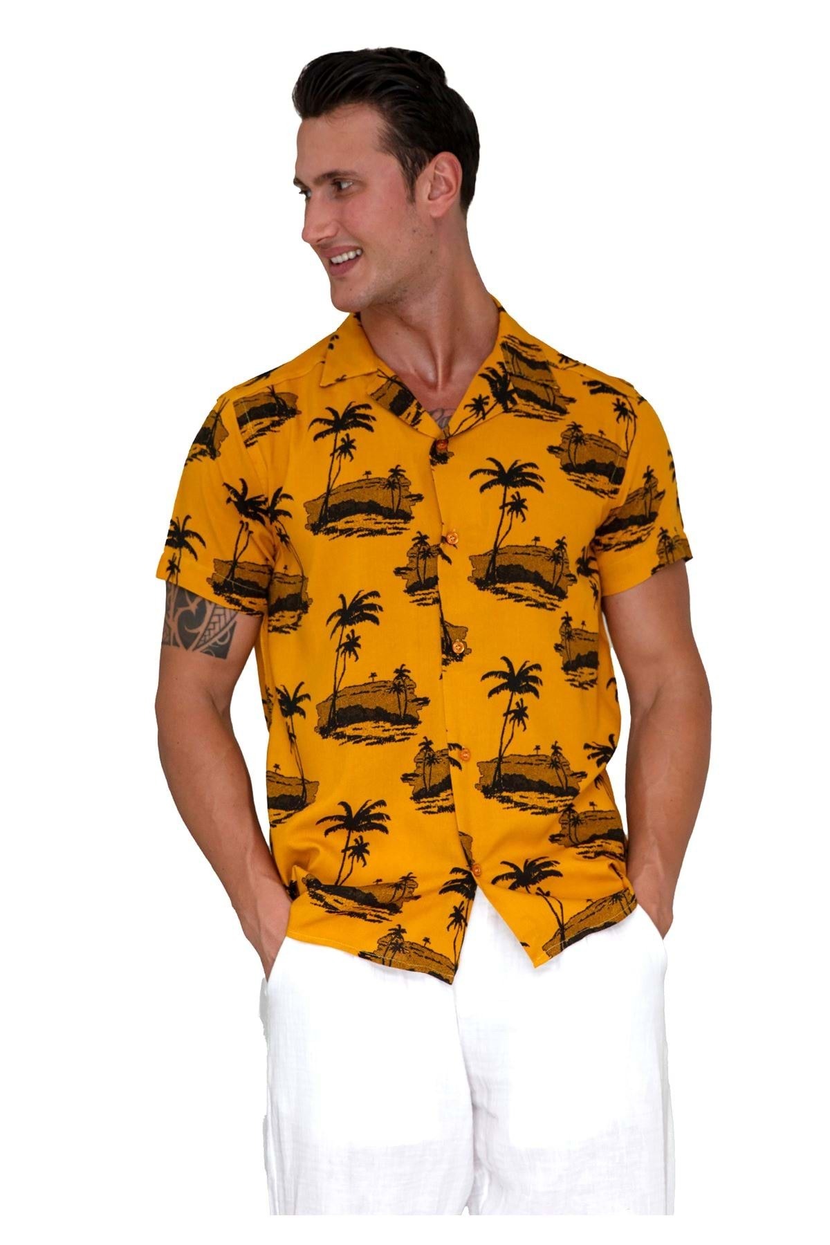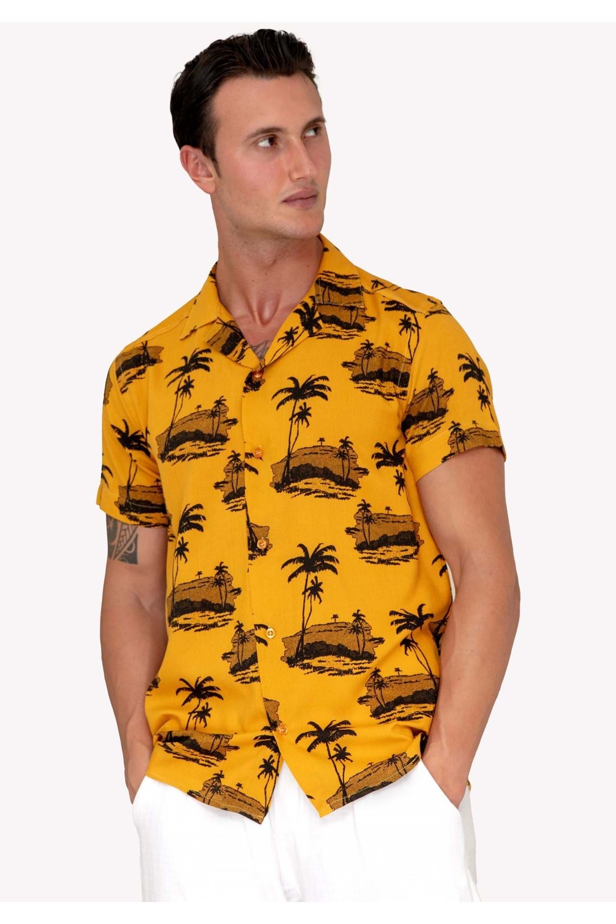 پیراهن آستین کوتاه گشاد و راحت هاوایی سایز بزرگ طرح پاملی یلی مشکی خردلی ویسکوز