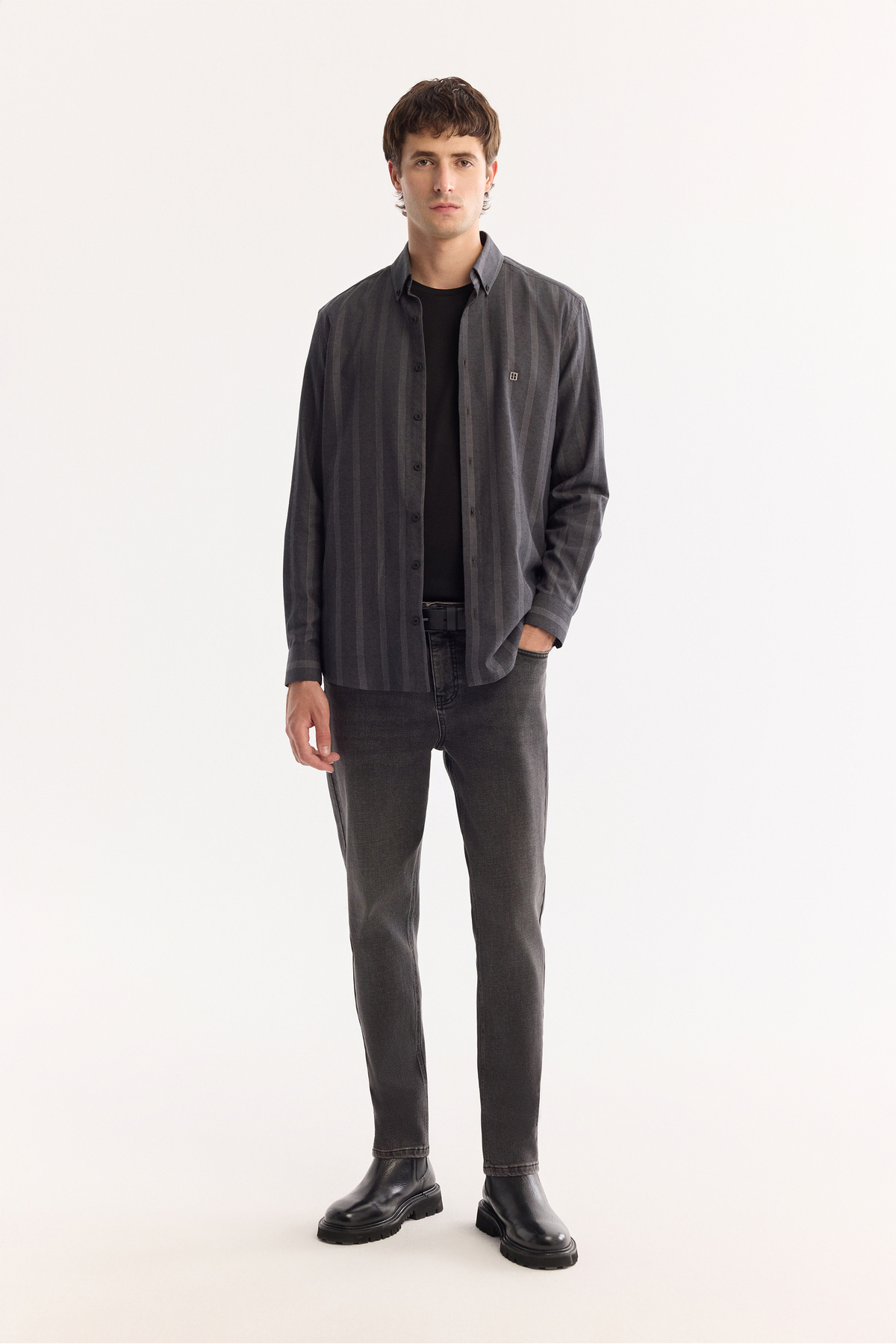 پیراهن مردانه یقه دکمهدار آنتراسیت، ۱۰۰٪ پنبه، آکسفورد، سافت تاچ، سایز معمولی، A52Y2048