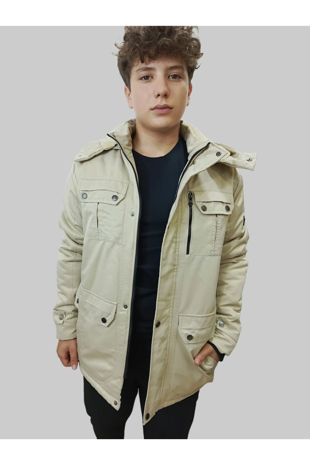 پالتو/پارکای زمستانی مردانه به رنگ کرم با آستر خز و کلاه ثابت