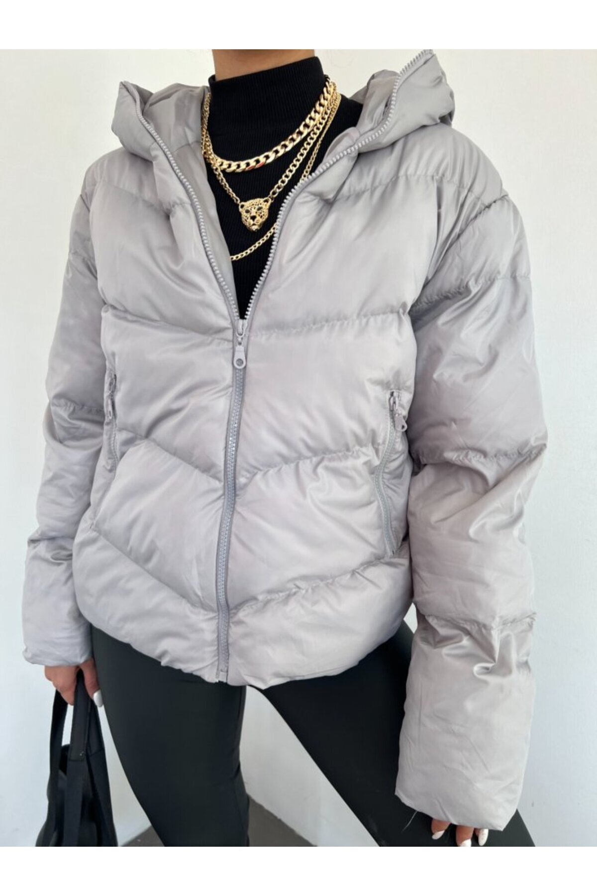 کاپشن زمستانی با کلاه و زیپ ثابت – خاکستری – مجموعه