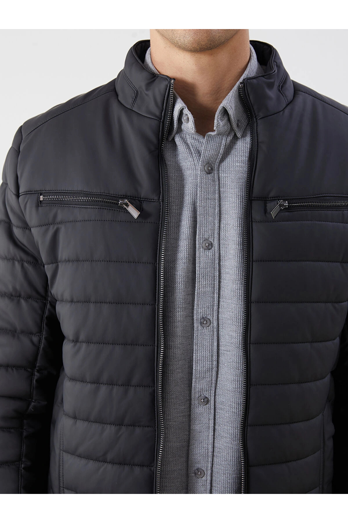 کاپشن چرمی مردانه یقه ایستاده باریک مشکی LCW Vision