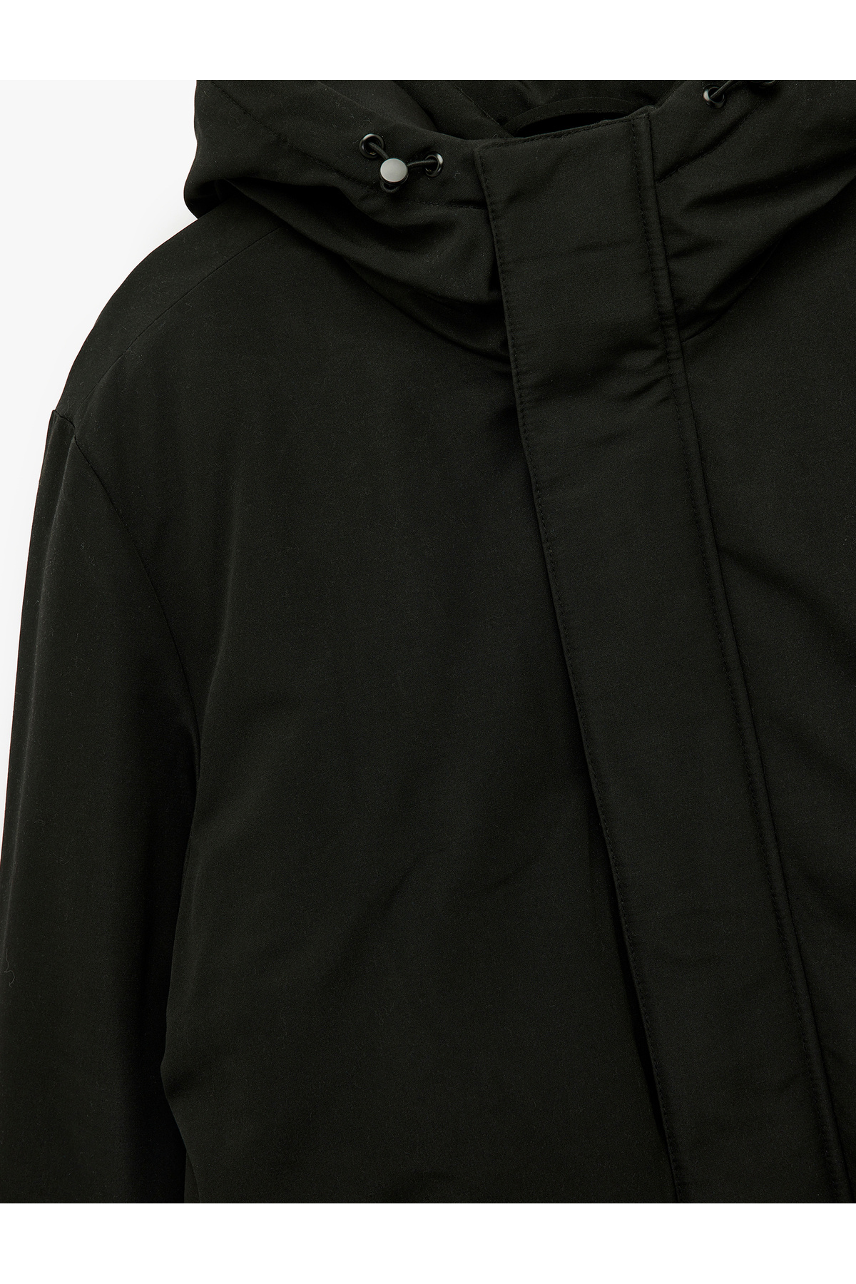کاپشن پفی زمستانی کلاهدار با دکمههای فشاری، جیبهای زیپدار