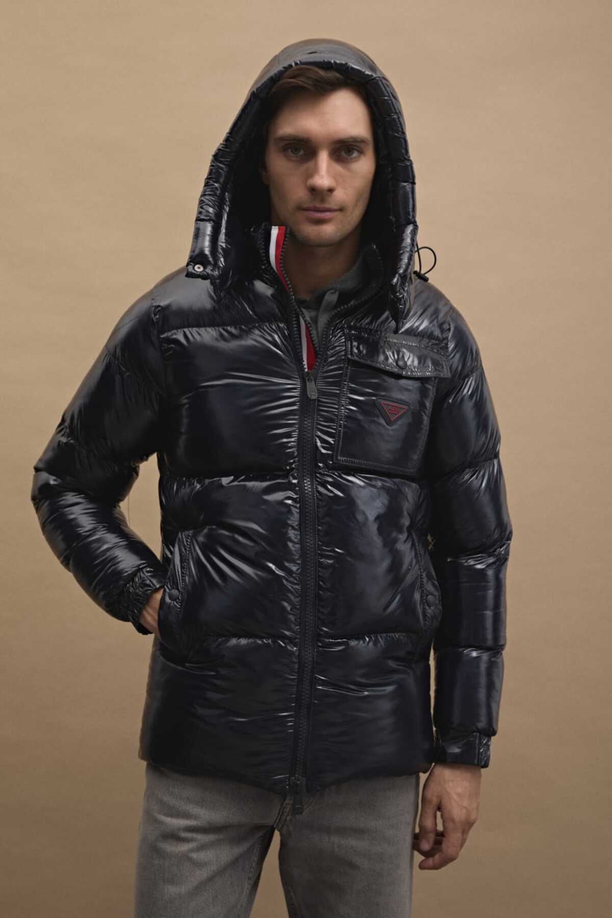 کاپشن پفی براق با کلاه جداشونده، مشکی