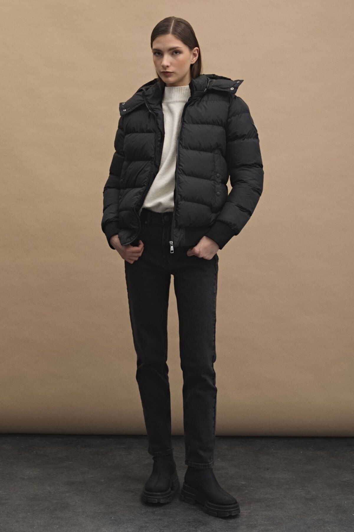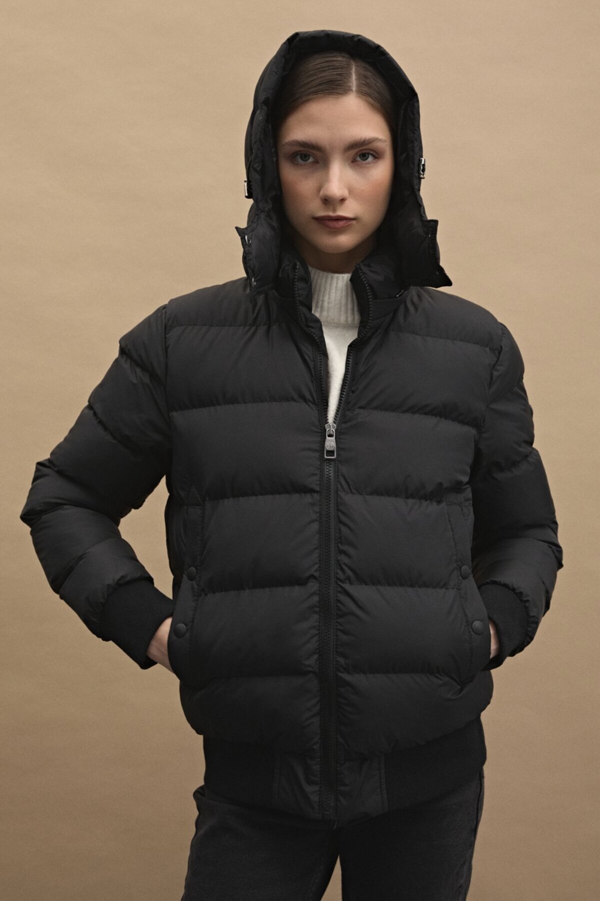 کاپشن پفی کلاه‌دار زنانه ضد آب و باد، مشکی