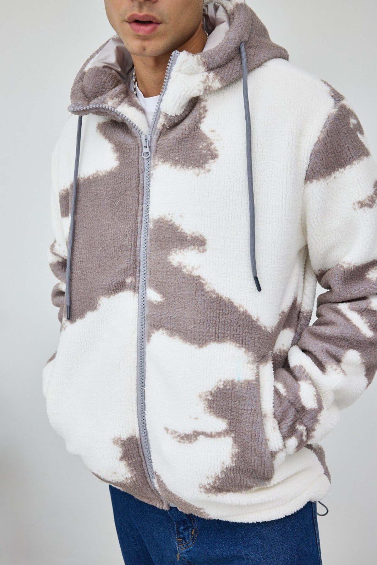 ژاکت مخمل کلاهدار خاکستری آستردار طرح ابری