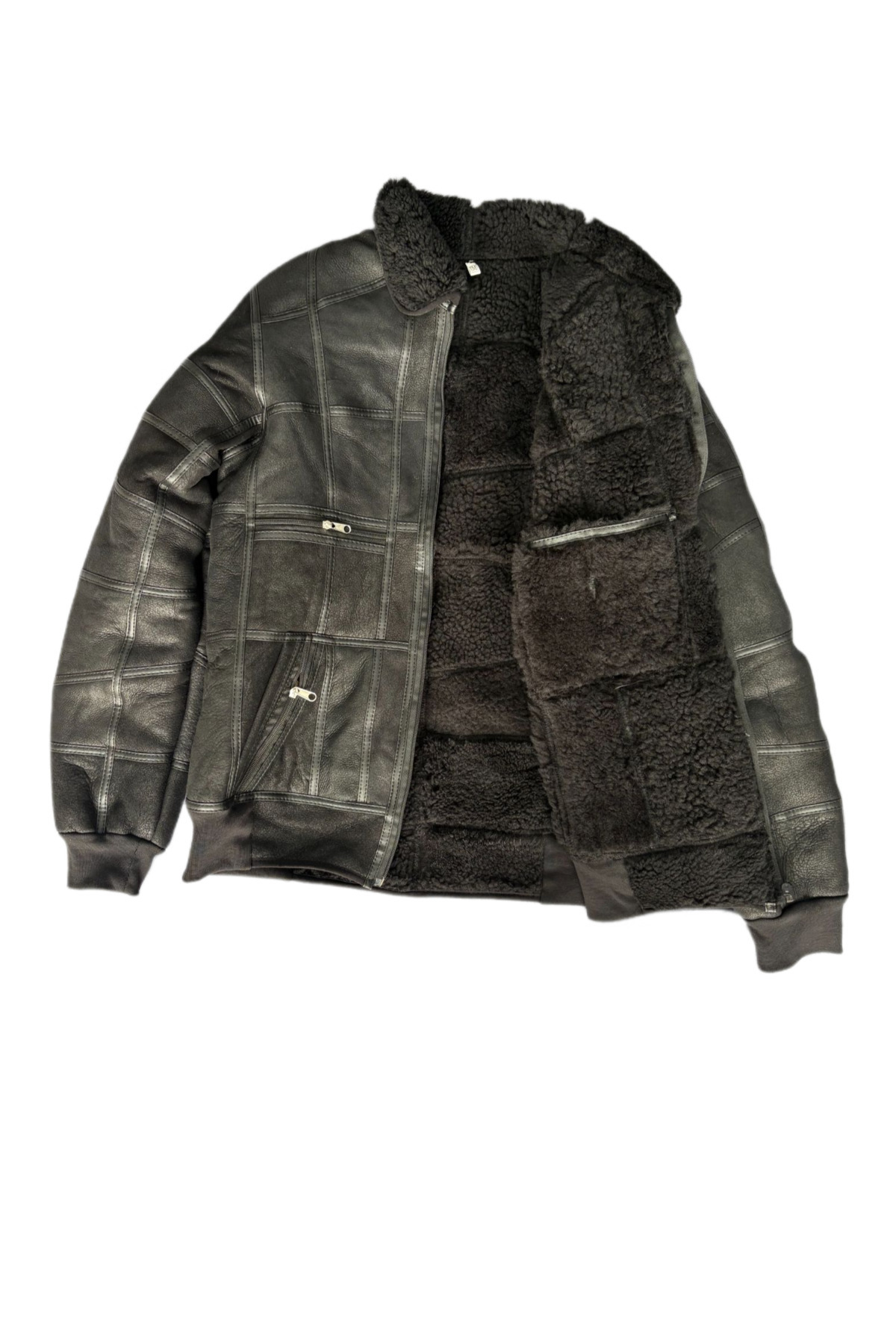 کت یقهدار چرم اصل جیر-خزدار چهلتکه با جزئیات گلدوزی و بافتنی
