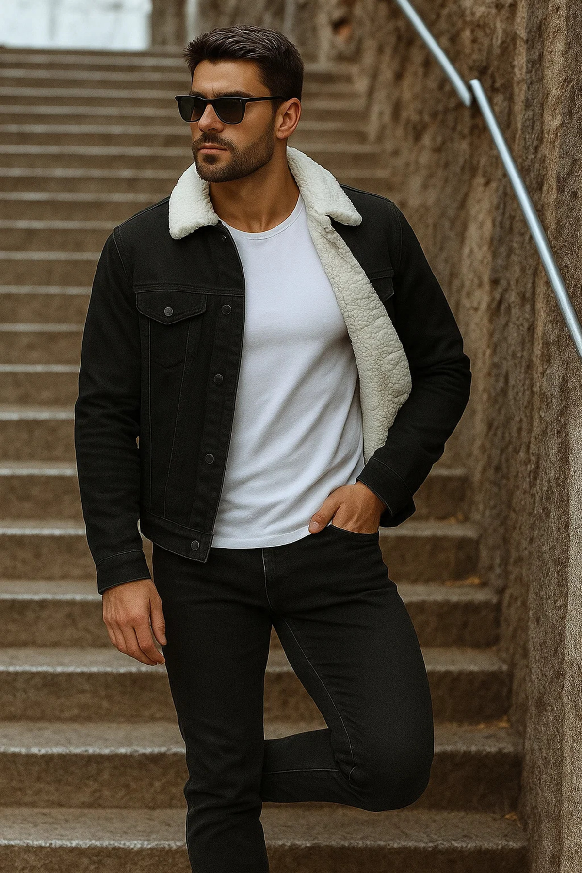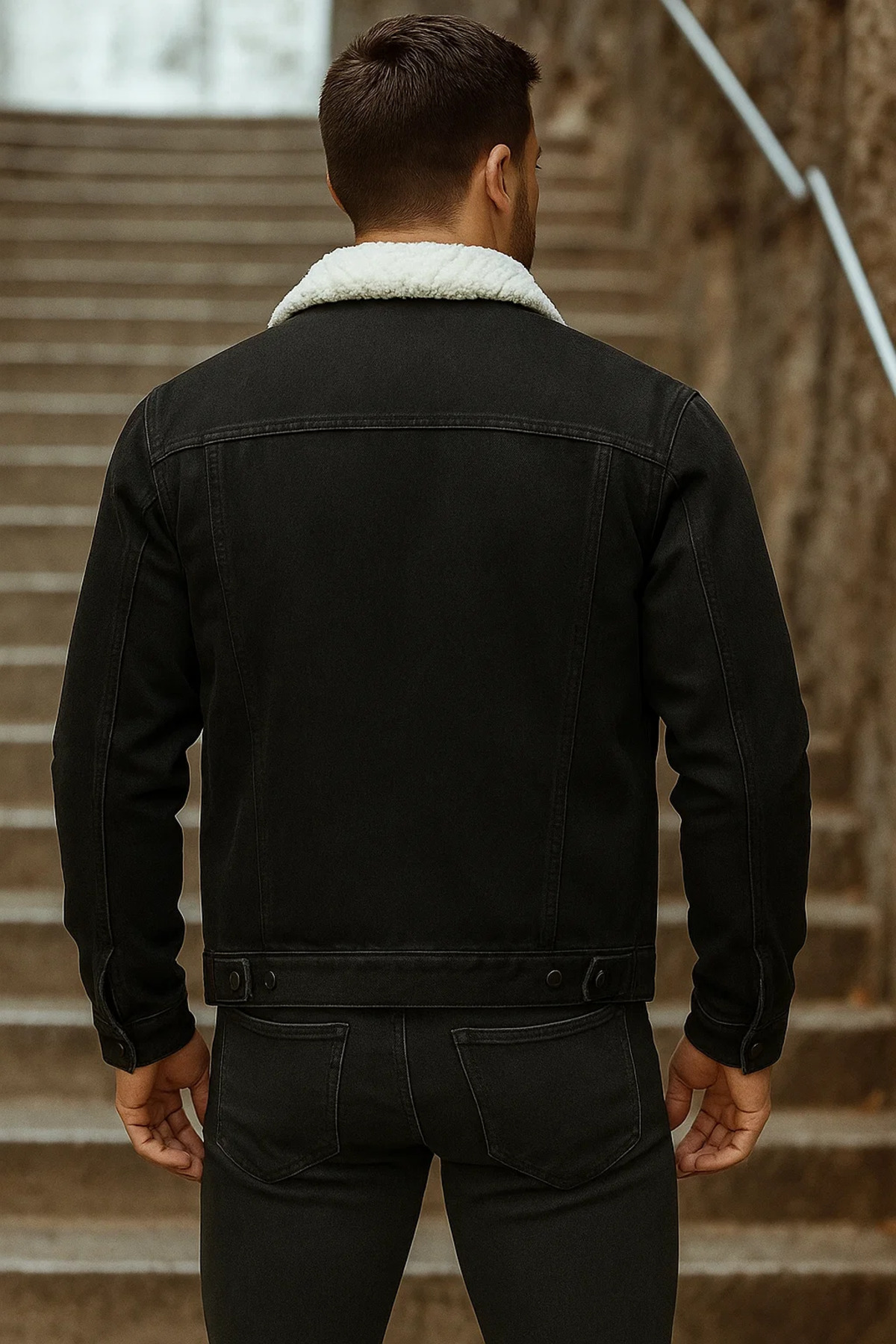 ژاکت جین مشکی مردانه شیک زمستانی با آستر خز