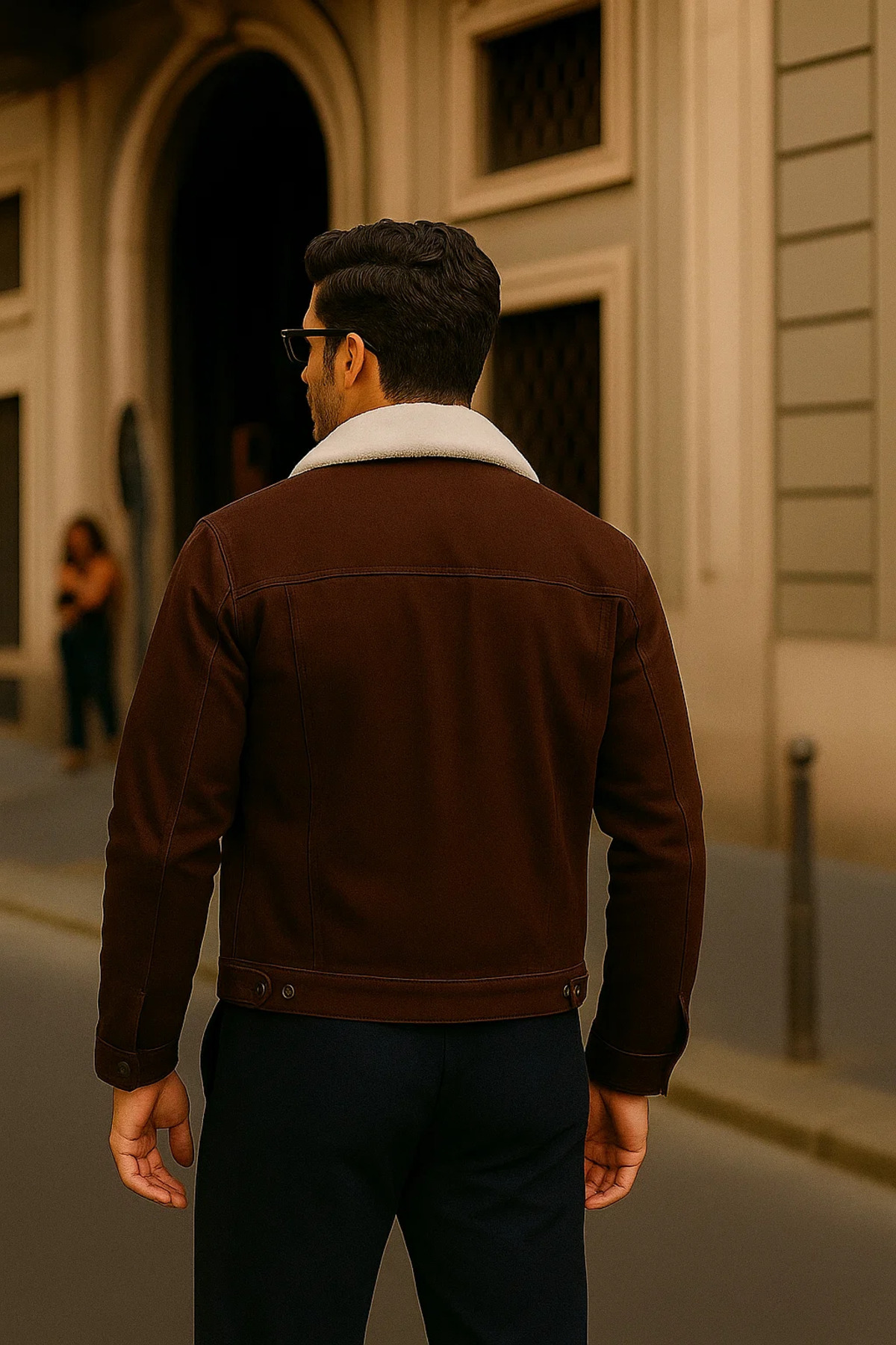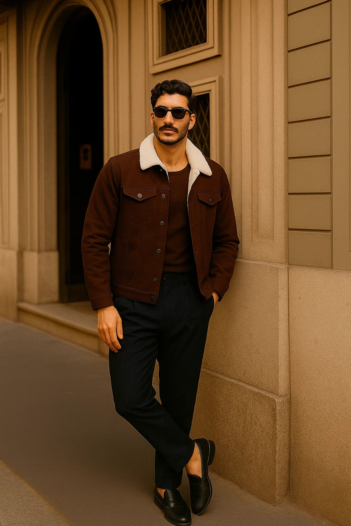 کاپشن جین مردانه زمستانی کژوال کلاسیک قهوهای تیره با آستر خز