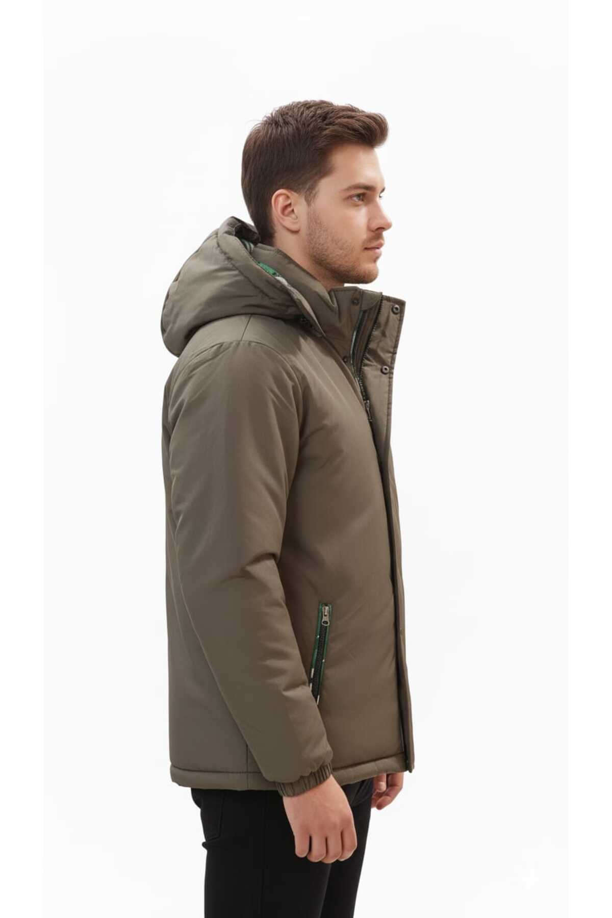 کاپشن پفی زمستانی مردانه مدل خاکی سبز کلاه دار، مناسب برای فضای باز
