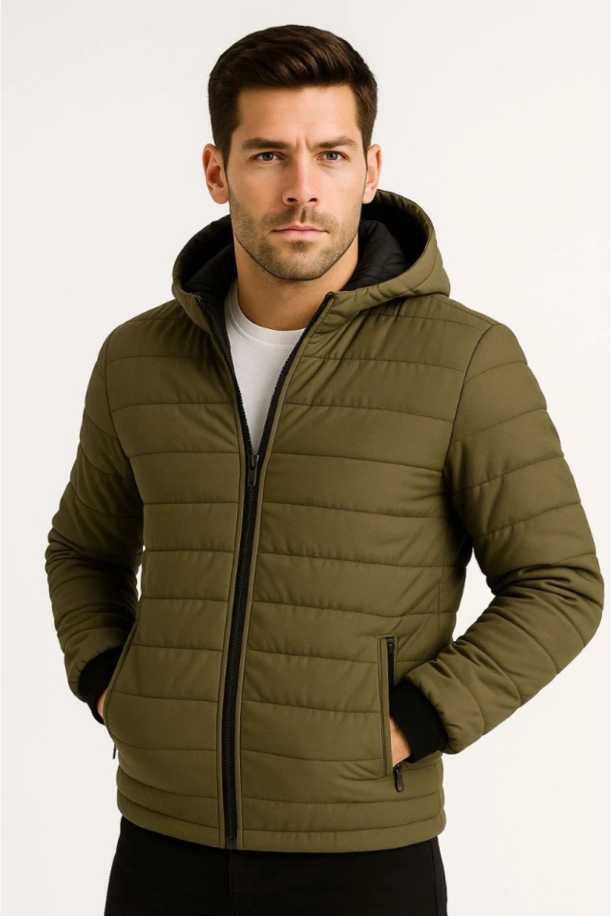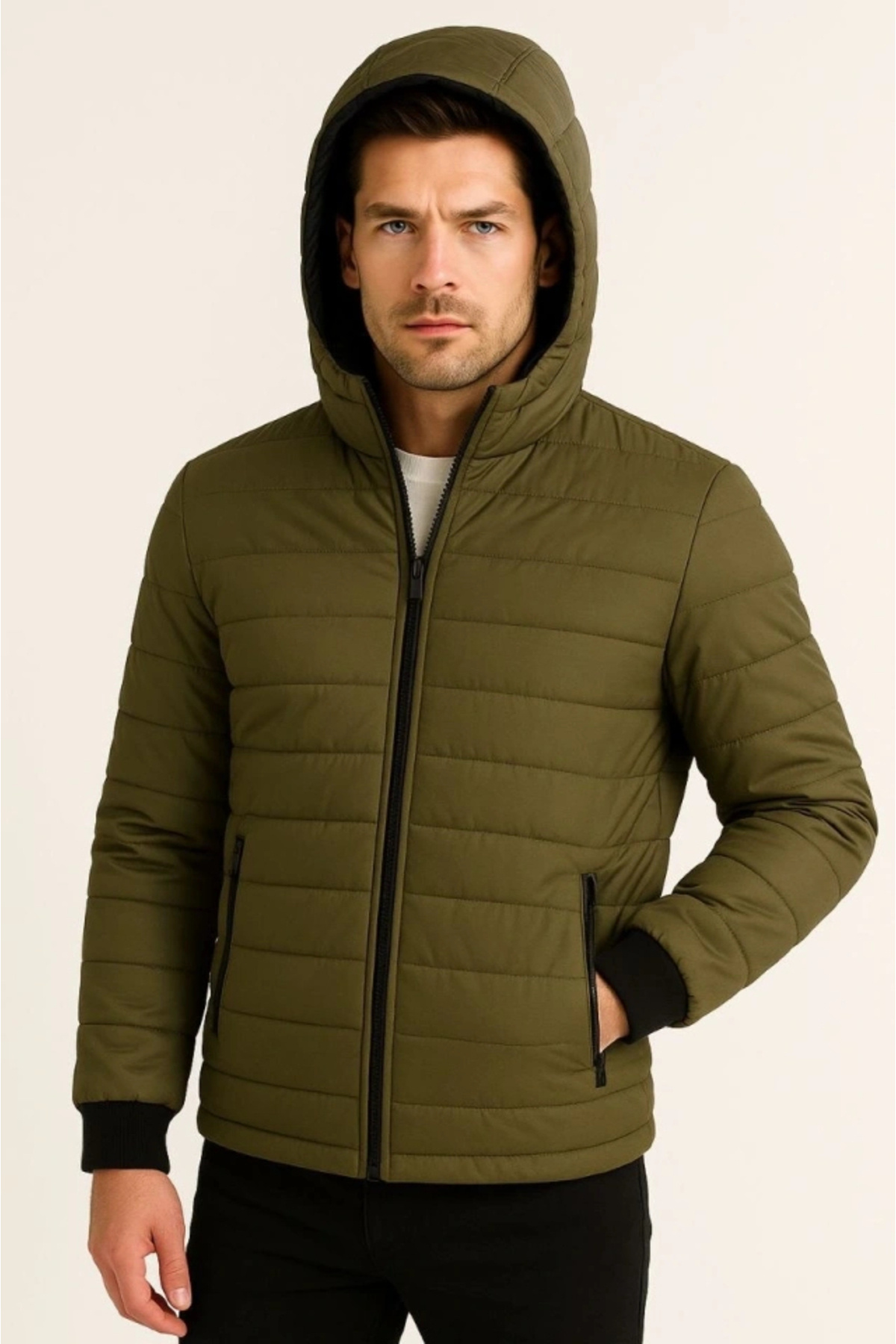 کاپشن مردانه زیپدار کلاهدار و پددار با آستر لحافی ضد آب، جیبدار، مناسب برای زمستان – خاکی