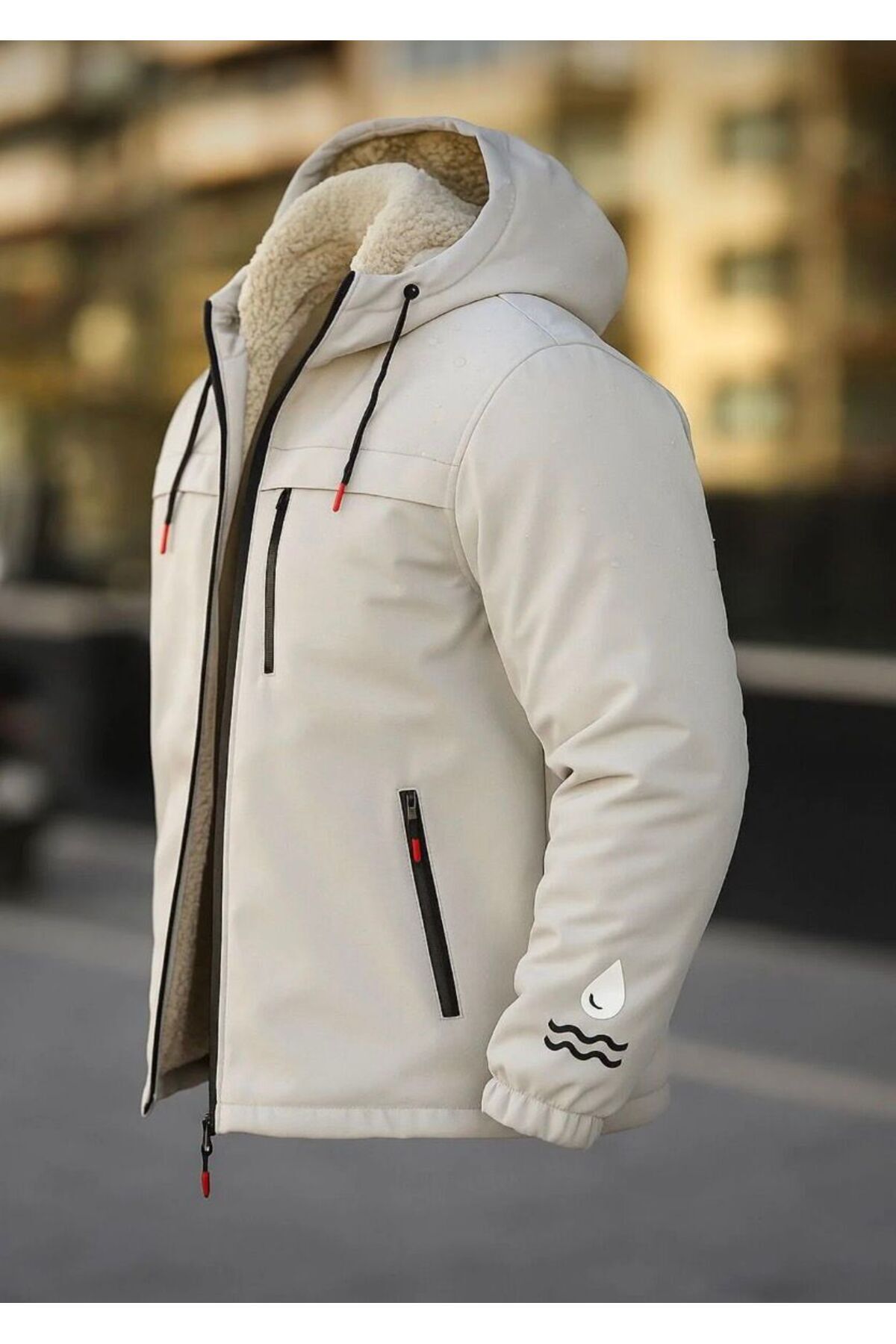 بارانی کلاه‌دار مردانه با آستر خز، رنگ کرم روشن