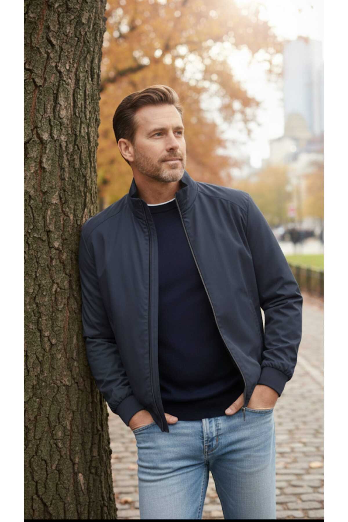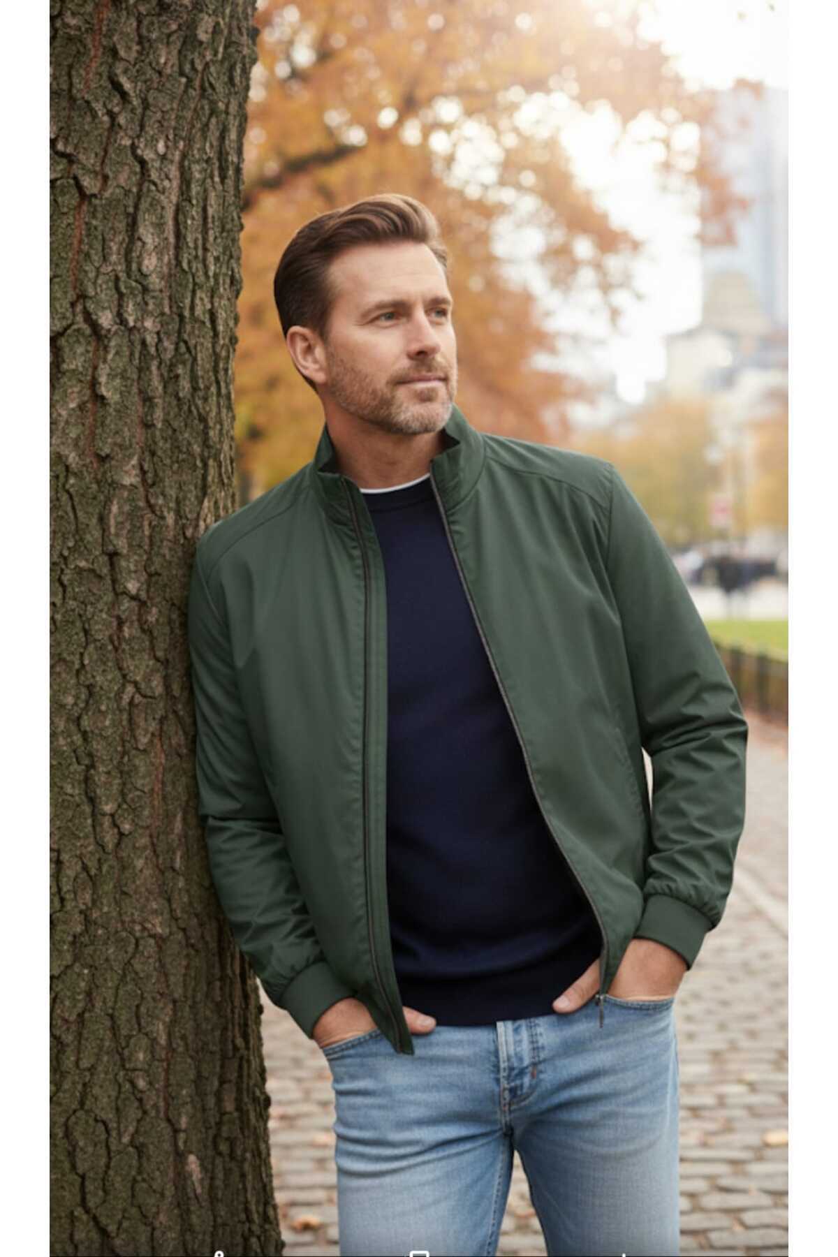 کاپشن فصلی مردانه با زیپ دو طرفه، یقه ایستاده، و پایین و آستینهای کشسان (لاستیک).