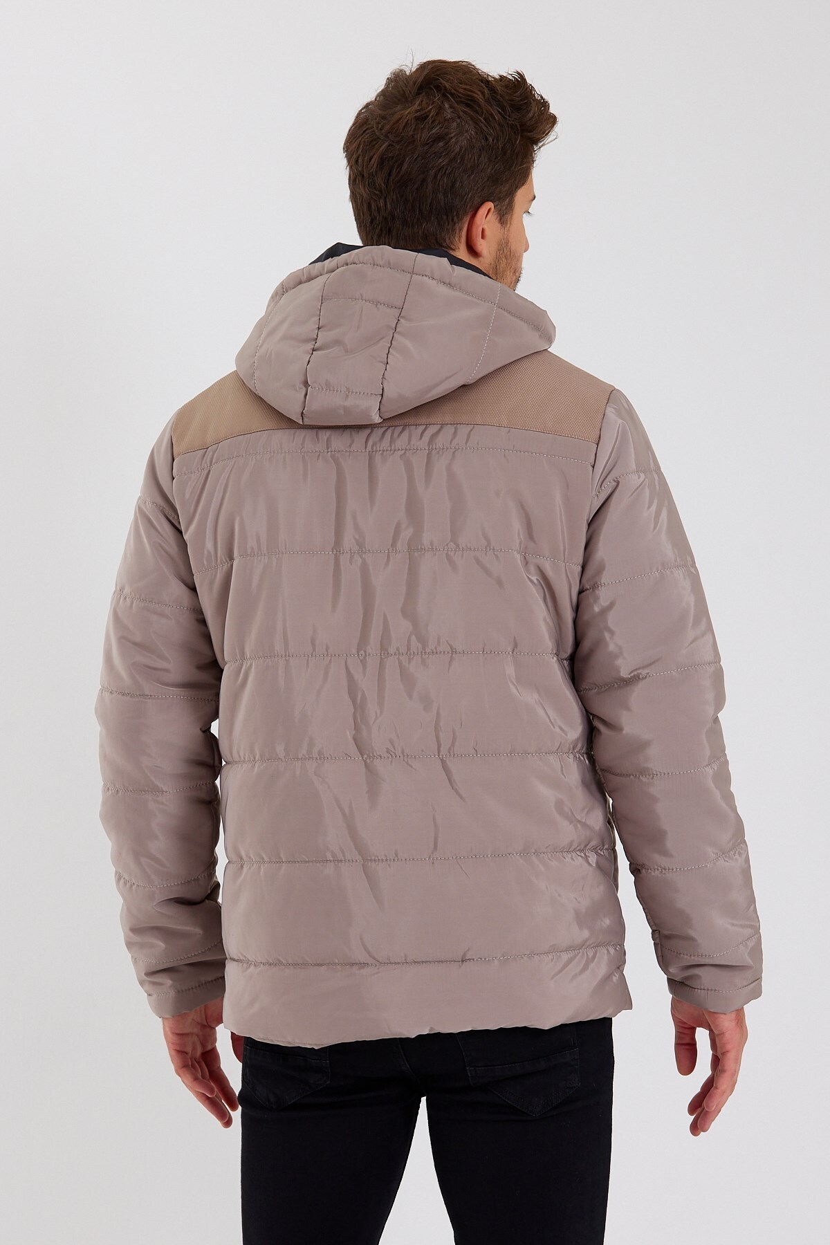 کاپشن لحاف دوزی شده مردانه به رنگ کرم، کلاه قابل جدا شدن، جیبهای داخلی و آستر خز قابل شستشو.