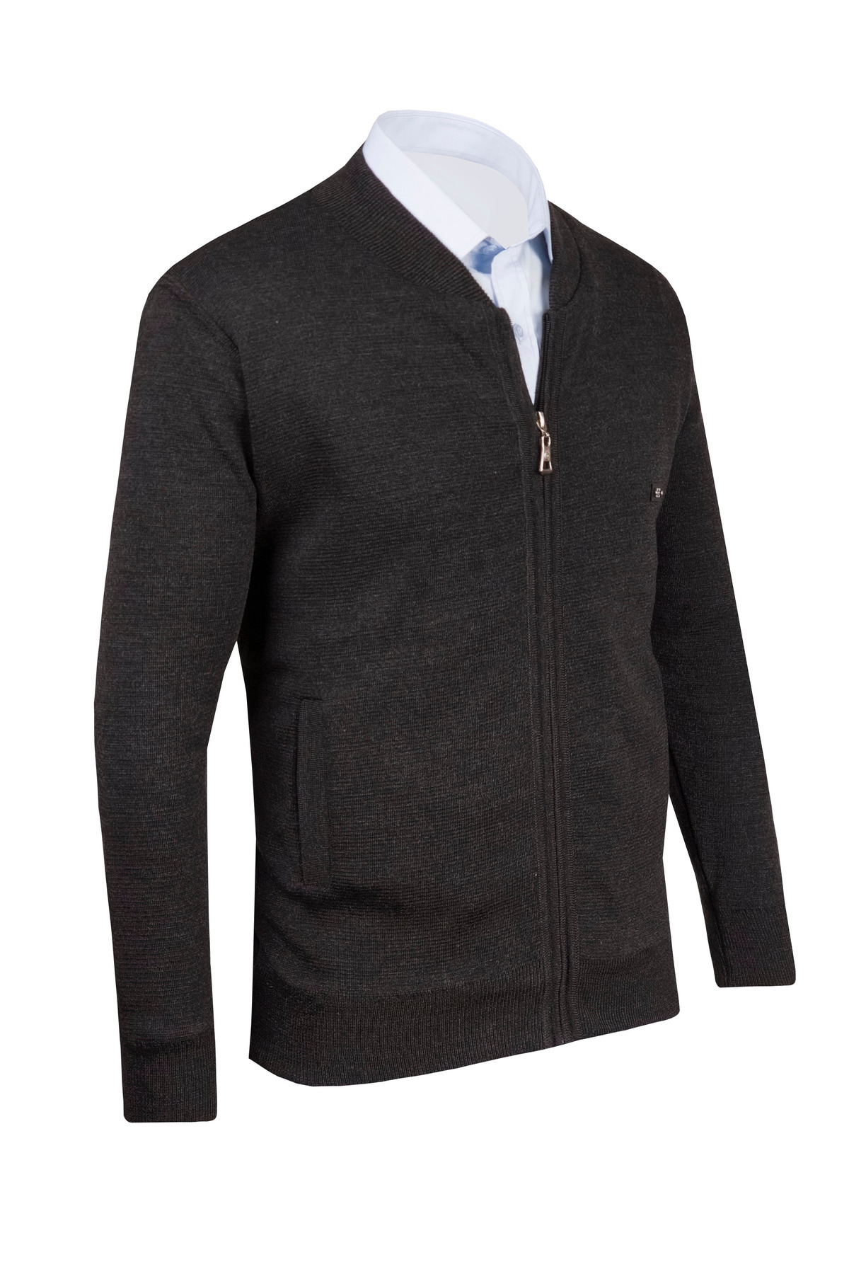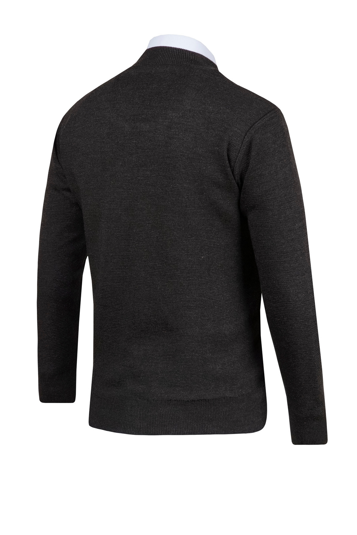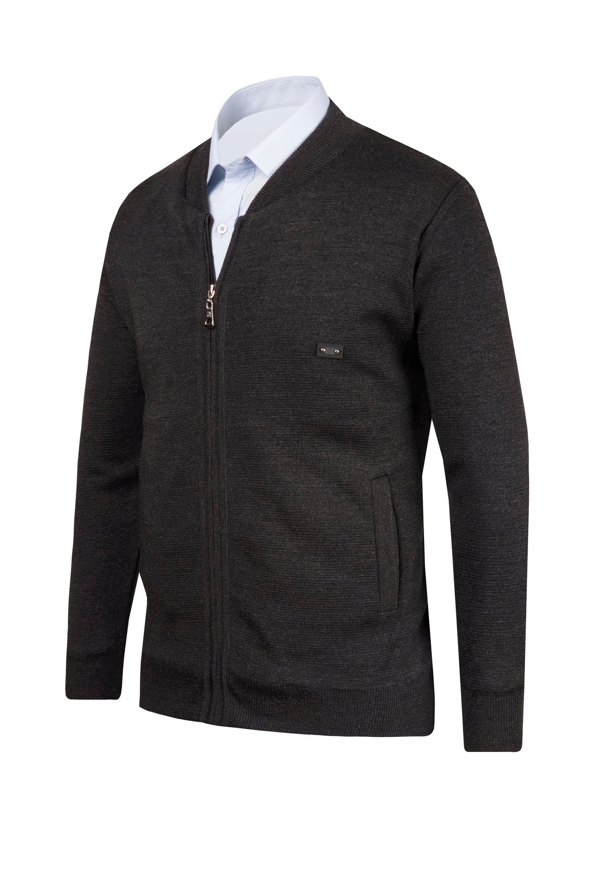 پیراهن یقهدار مردانه، آستردار، ژاکت بافتنی خاکستری تیره با زیپ و بافتنی استیل طرحدار.