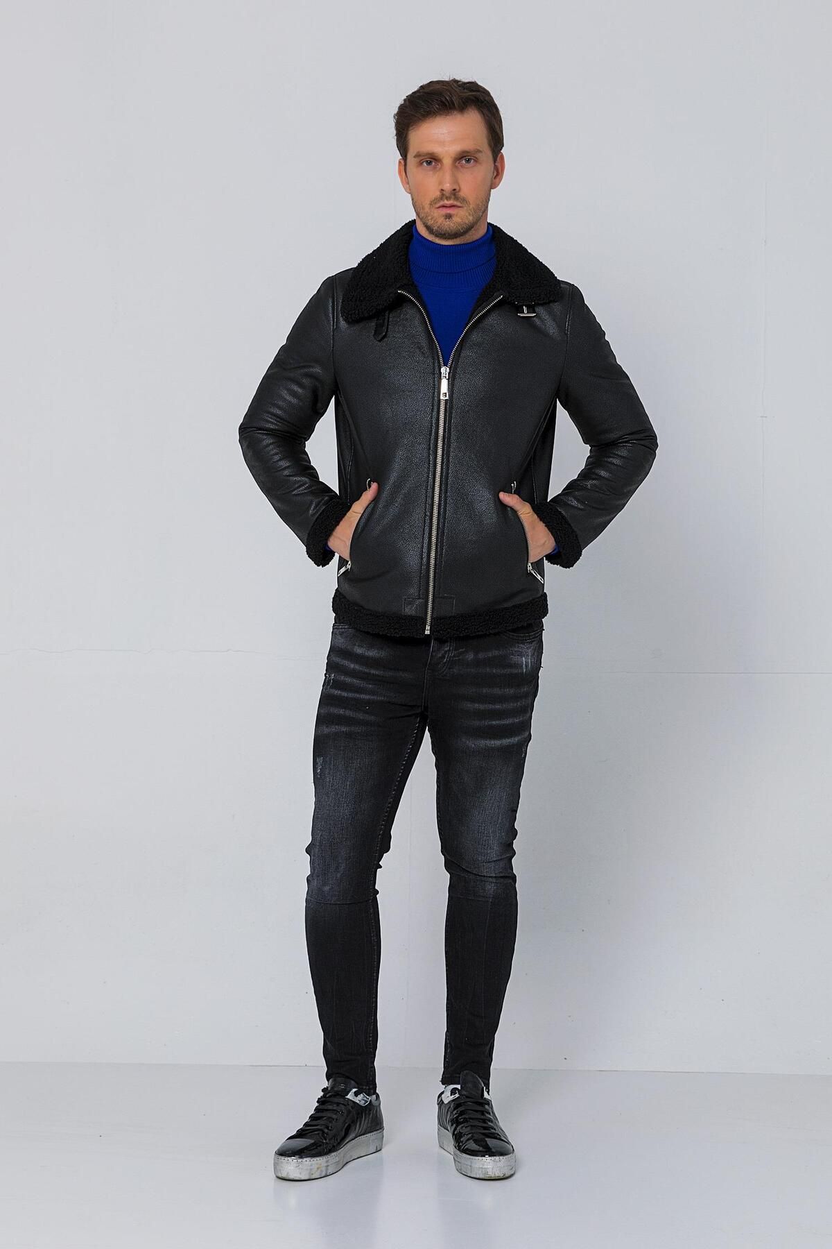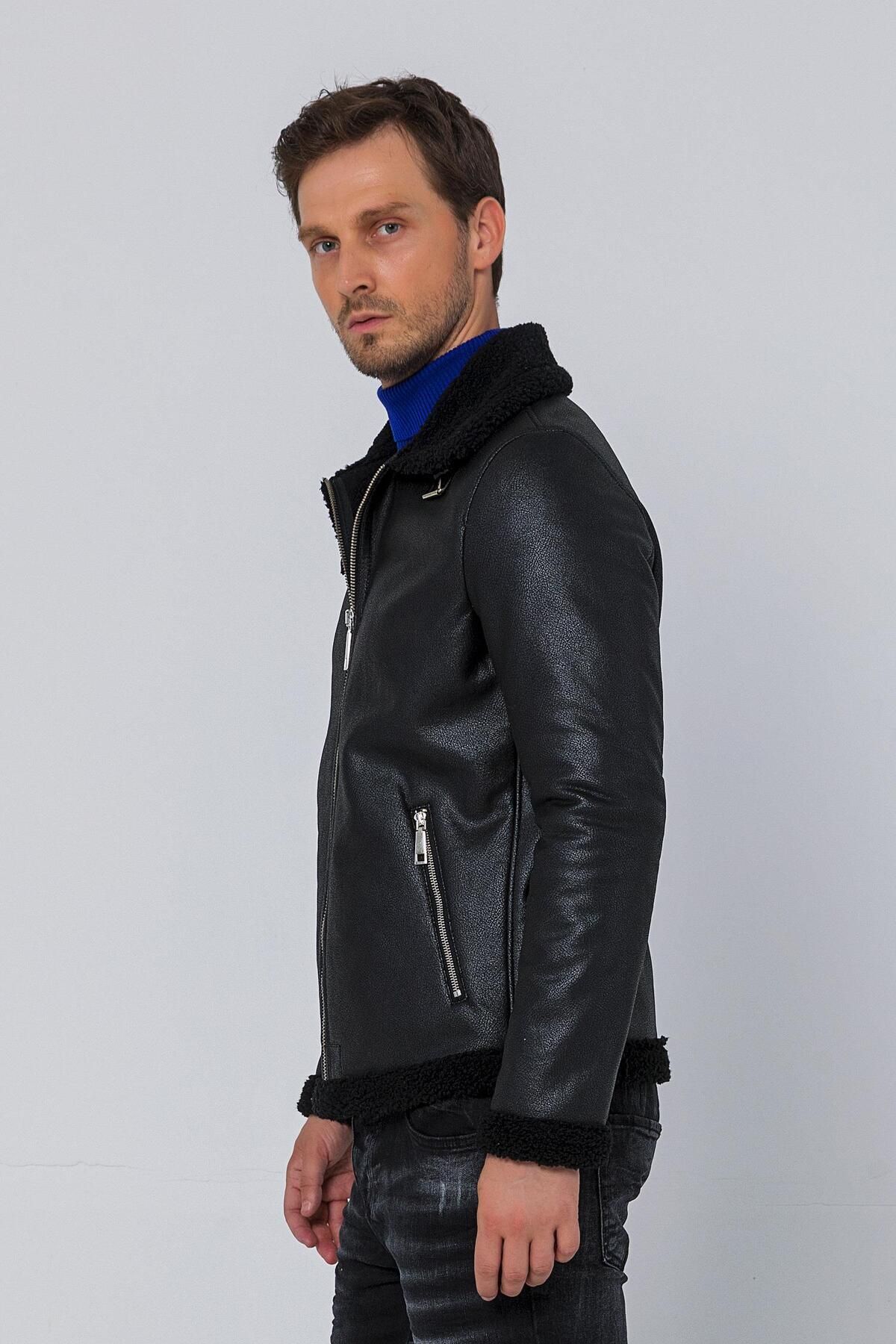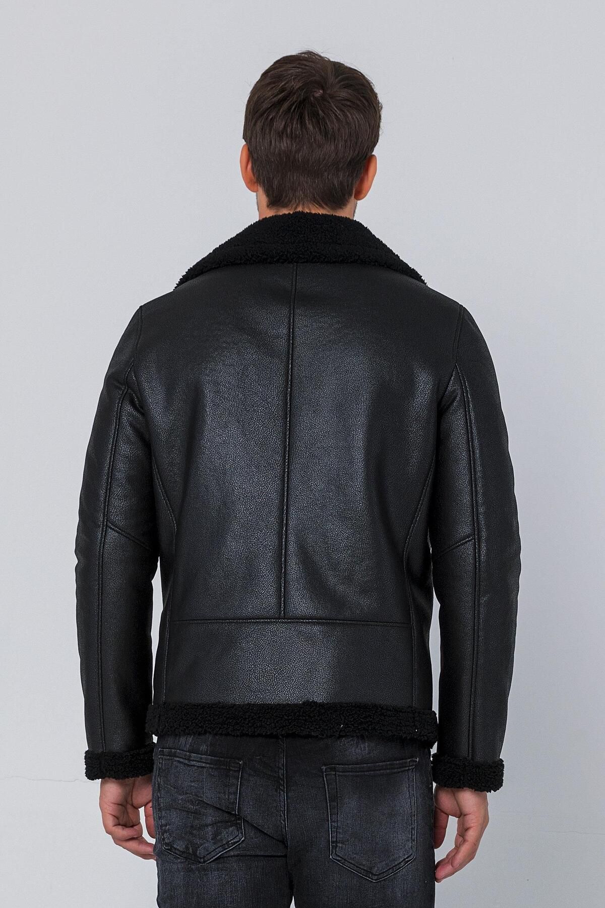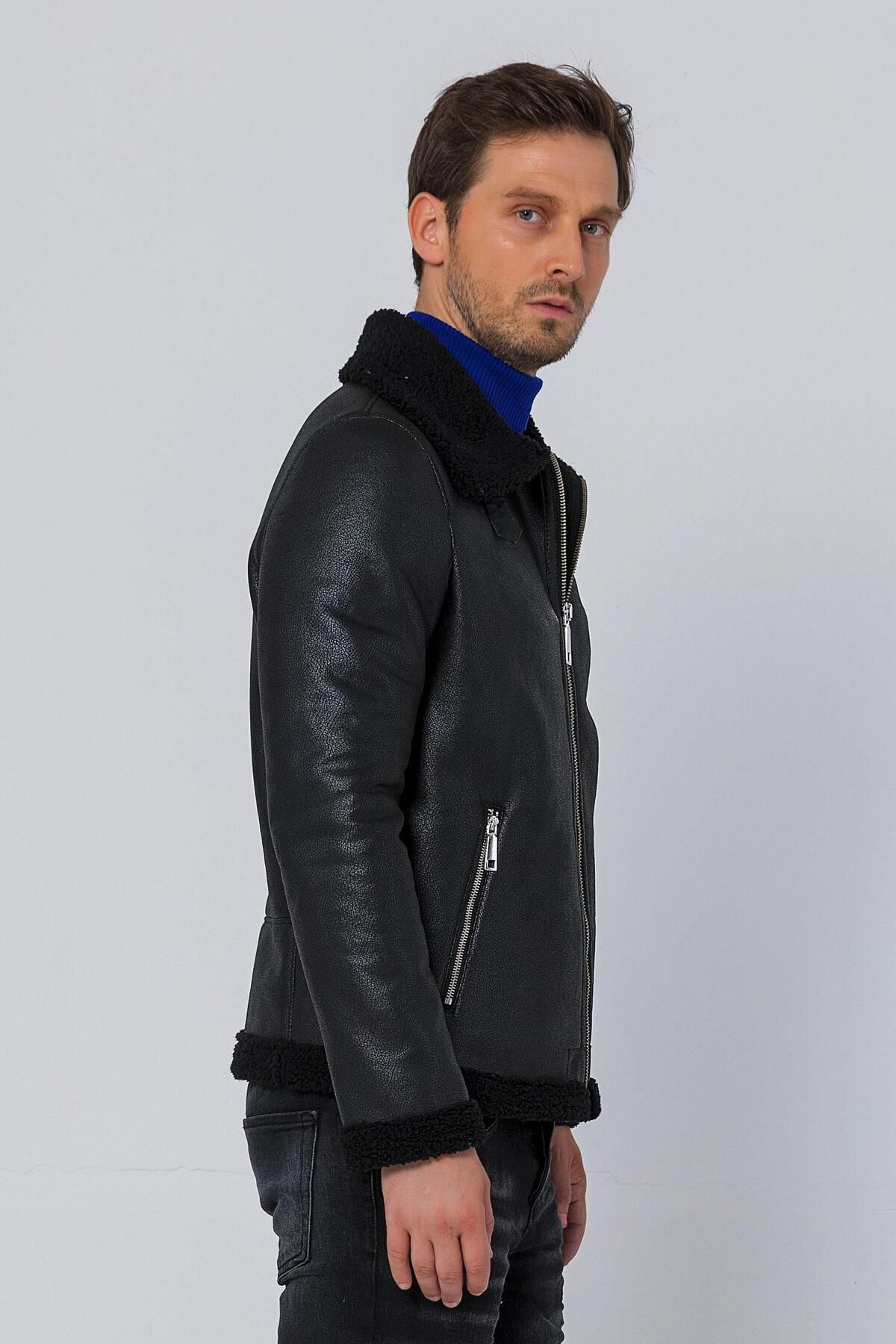 کاپشن مردانه چرم مصنوعی کلاسیک زیپدار مشکی سایز معمولی با آستر پشمی