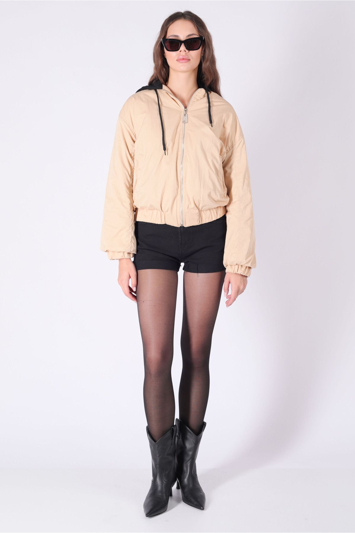 کاپشن کوتاه کلاهدار بژ با آستر پددار و پشت گلدوزی شده.