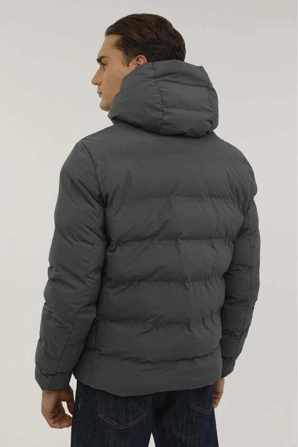 کاپشن پفی مردانه کلاهدار با جزئیات نشان – کت نولان، خاکستری تیره